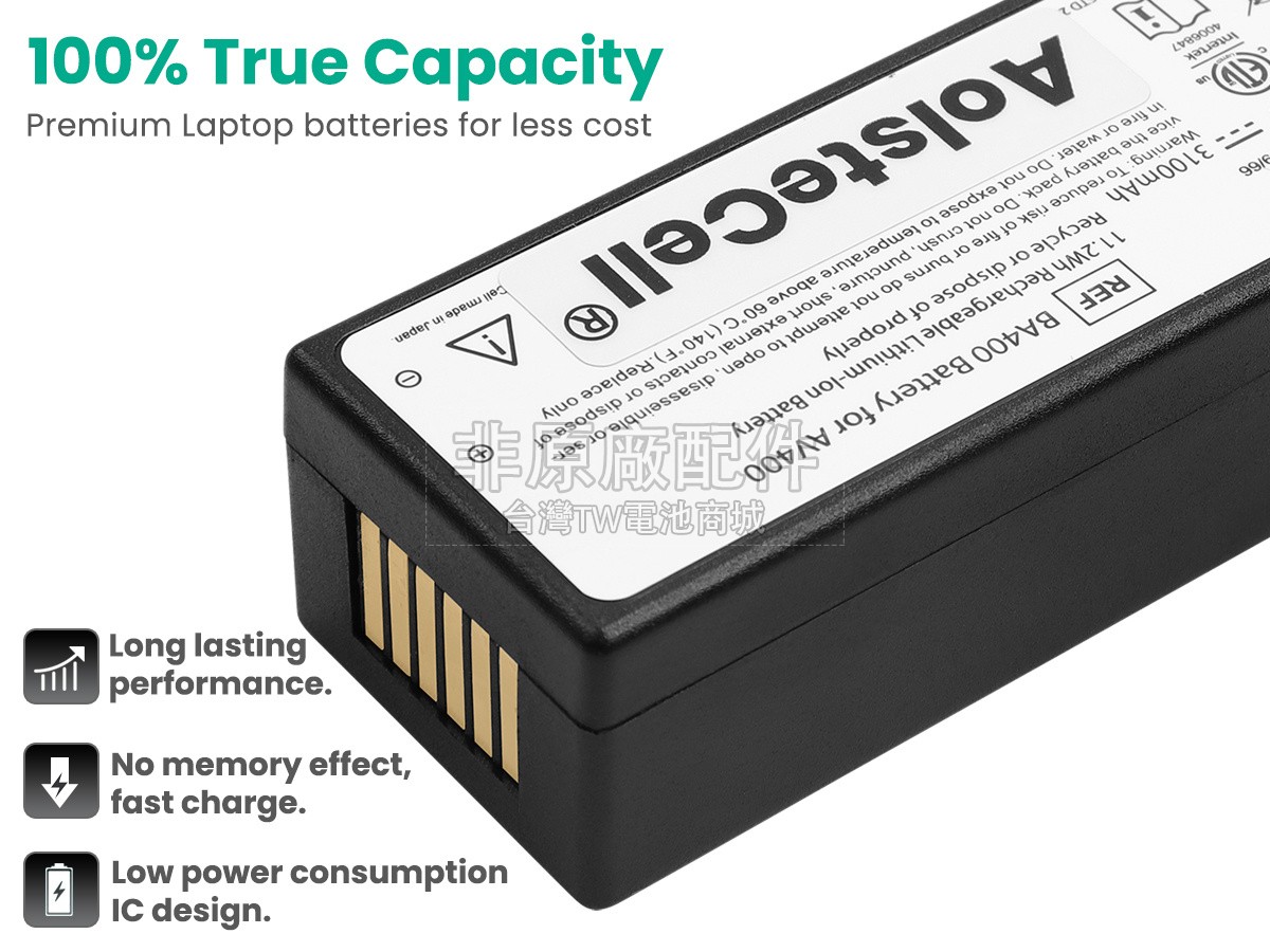 台灣TW電池商城售賣的所有電池均為100%真實容量,我們絕不會在參數上造假。對於製造商提供的每一款電池,我們都會安排技術人員進行參數測試,以確保我們售賣的電池都符合各種認證的要求、100%安全和100%兼容。極少數情況下,電池參數表上的容量會比電池實物圖上的容量低,這是因為我們檢測時發現製造商給出的電池容量偏高,與電池實際容量不符。於是我們會把電池的實際容量準確地填寫在參數表上,讓顧客直接看到電池的真實容量!這款AccuVein BA400電池和原廠有什麼區別?