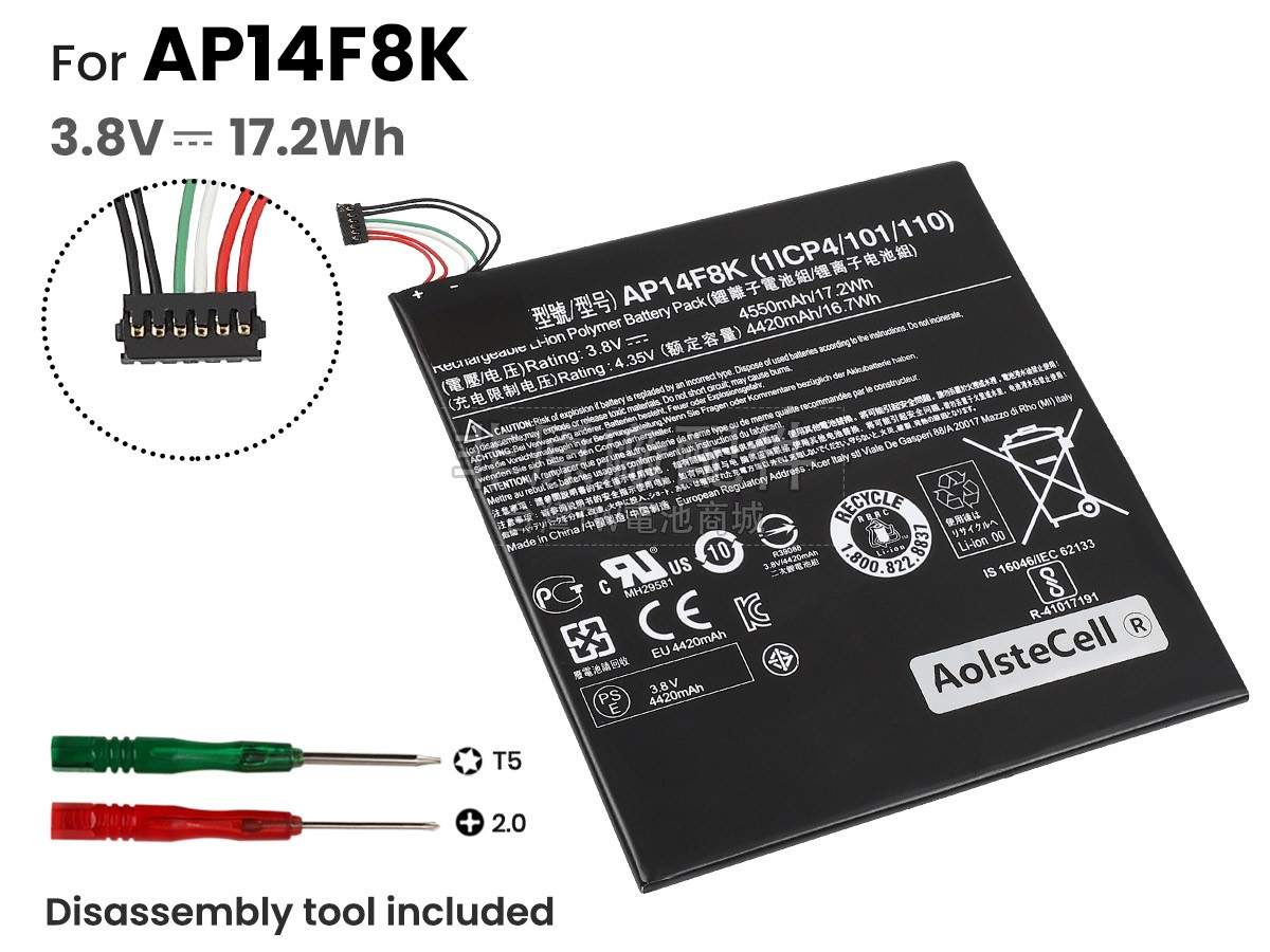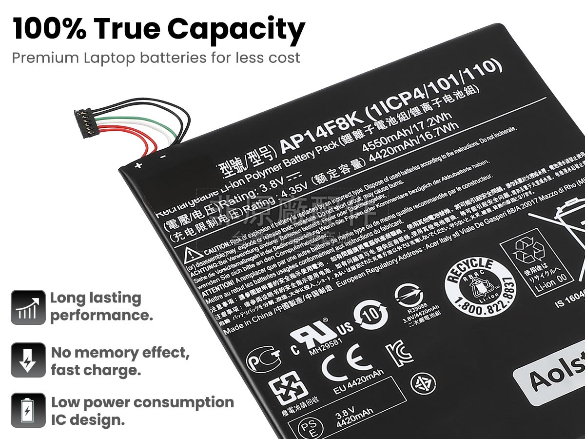 台灣TW電池商城售賣的所有電池均為100%真實容量,我們絕不會在參數上造假。對於製造商提供的每一款電池,我們都會安排技術人員進行參數測試,以確保我們售賣的電池都符合各種認證的要求、100%安全和100%兼容對應的筆記型電腦。極少數情況下,電池參數表上的容量會比電池實物圖上的容量低,這是因為我們檢測時發現製造商給出的電池容量偏高,與電池實際容量不符。於是我們會把電池的實際容量準確地填寫在參數表上,讓顧客直接看到電池的真實容量!這款Acer AP14F8K電池和原廠有什麼區別?