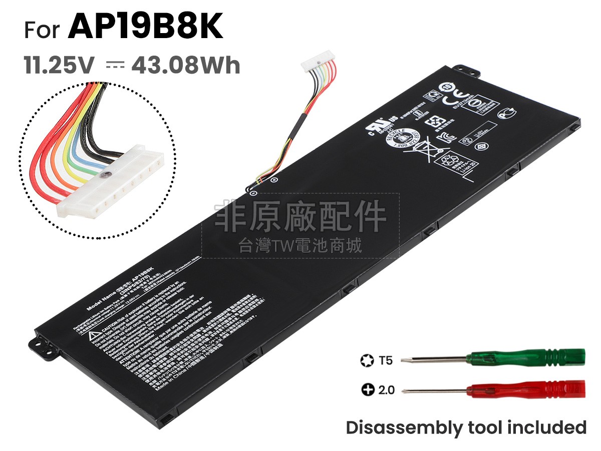 台灣TW電池商城售賣的所有電池均為100%真實容量,我們絕不會在參數上造假。對於製造商提供的每一款電池,我們都會安排技術人員進行參數測試,以確保我們售賣的電池都符合各種認證的要求、100%安全和100%兼容對應的筆記型電腦。極少數情況下,電池參數表上的容量會比電池實物圖上的容量低,這是因為我們檢測時發現製造商給出的電池容量偏高,與電池實際容量不符。於是我們會把電池的實際容量準確地填寫在參數表上,讓顧客直接看到電池的真實容量!這款Acer AP19B8K電池和原廠有什麼區別?