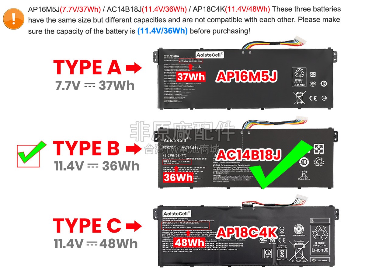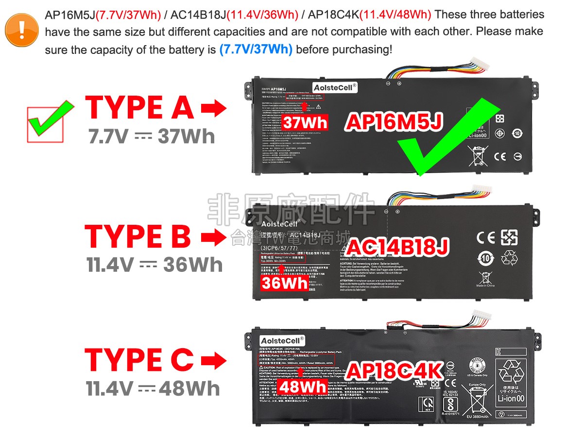 台灣TW電池商城售賣的所有電池均為100%真實容量,我們絕不會在參數上造假。對於製造商提供的每一款電池,我們都會安排技術人員進行參數測試,以確保我們售賣的電池都符合各種認證的要求、100%安全和100%兼容對應的筆記型電腦。極少數情況下,電池參數表上的容量會比電池實物圖上的容量低,這是因為我們檢測時發現製造商給出的電池容量偏高,與電池實際容量不符。於是我們會把電池的實際容量準確地填寫在參數表上,讓顧客直接看到電池的真實容量!這款Acer Aspire 3 A315-54K-32VZ電池和原廠有什麼區別?