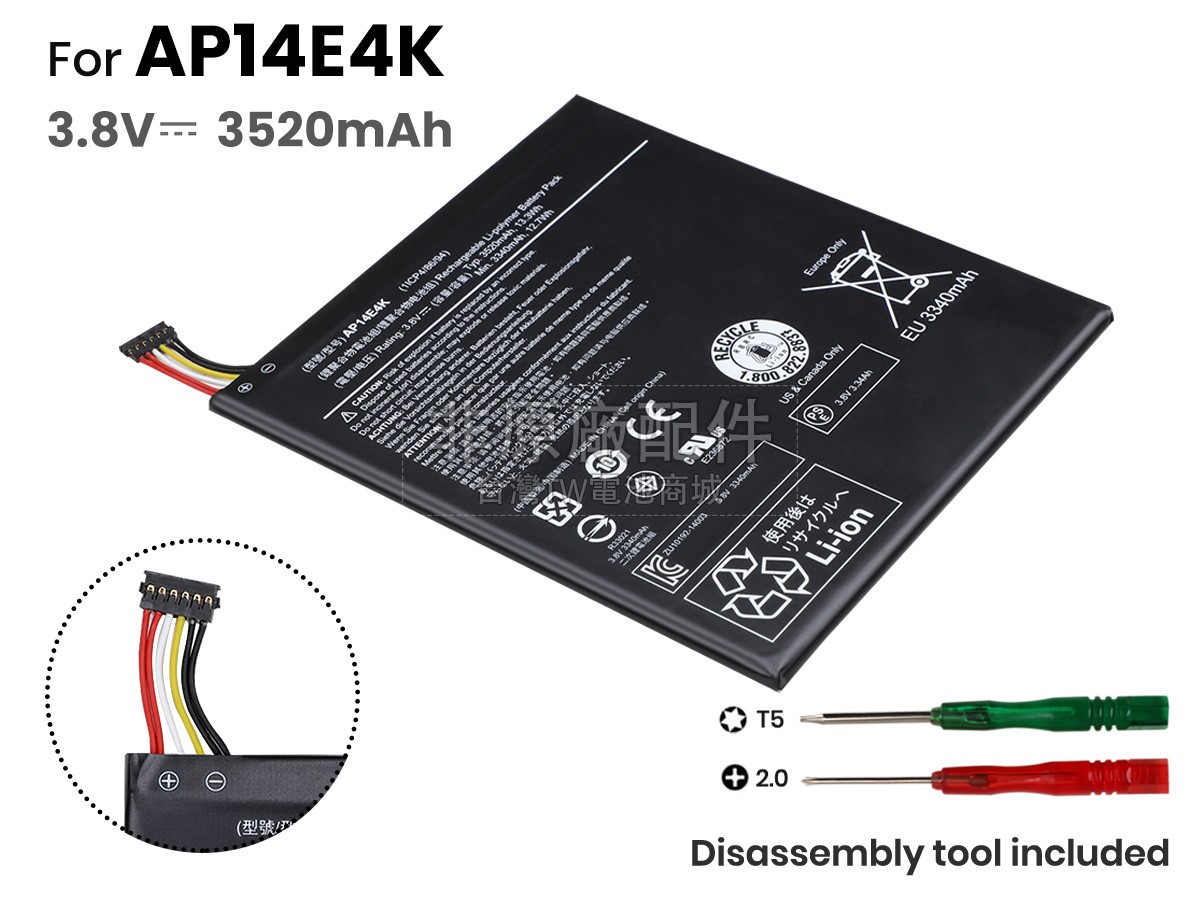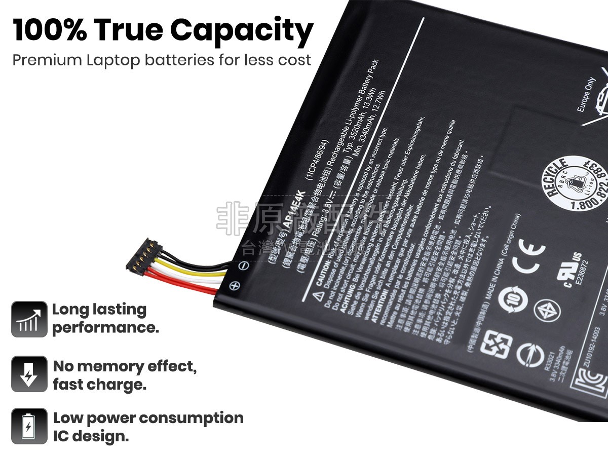 台灣TW電池商城售賣的所有電池均為100%真實容量,我們絕不會在參數上造假。對於製造商提供的每一款電池,我們都會安排技術人員進行參數測試,以確保我們售賣的電池都符合各種認證的要求、100%安全和100%兼容對應的筆記型電腦。極少數情況下,電池參數表上的容量會比電池實物圖上的容量低,這是因為我們檢測時發現製造商給出的電池容量偏高,與電池實際容量不符。於是我們會把電池的實際容量準確地填寫在參數表上,讓顧客直接看到電池的真實容量!這款Acer KT00104001電池和原廠有什麼區別?