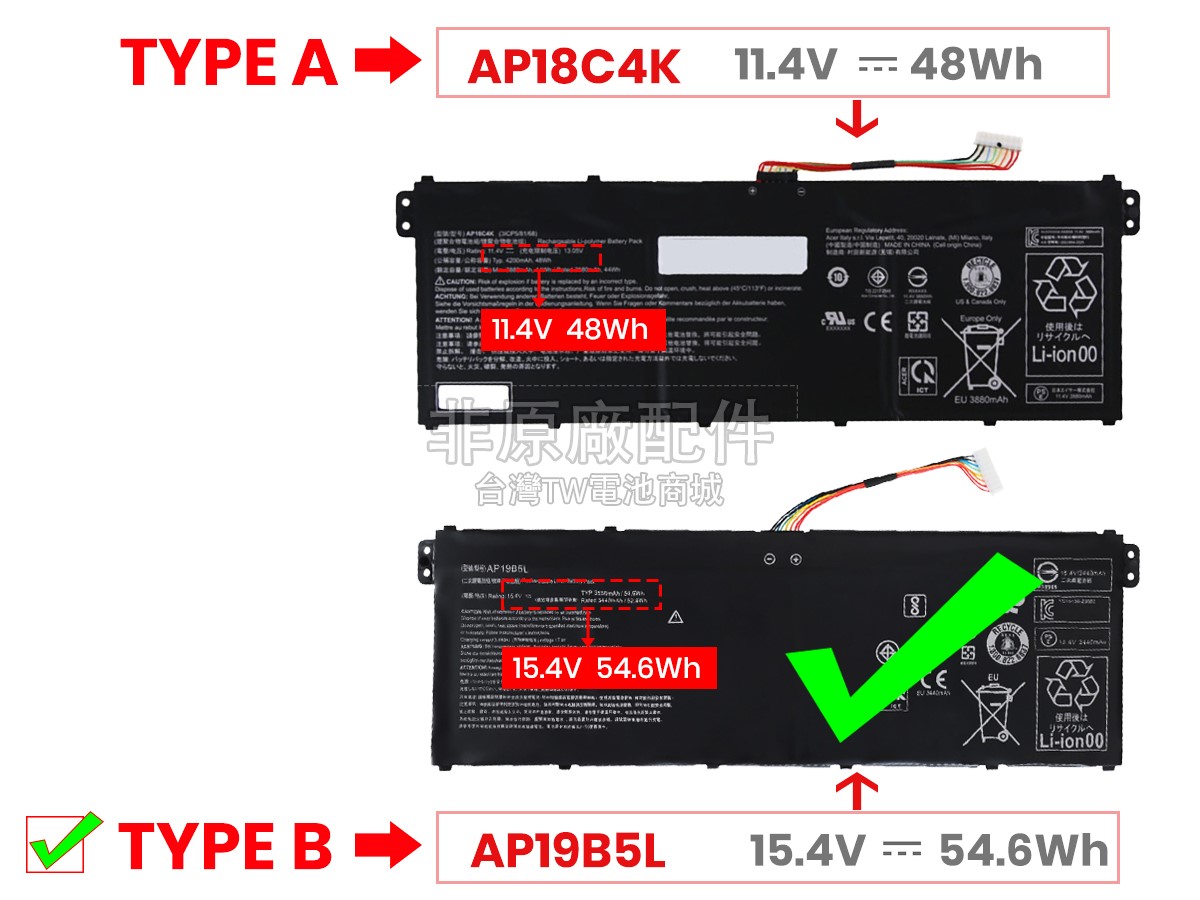 台灣TW電池商城售賣的所有電池均為100%真實容量,我們絕不會在參數上造假。對於製造商提供的每一款電池,我們都會安排技術人員進行參數測試,以確保我們售賣的電池都符合各種認證的要求、100%安全和100%兼容對應的筆記型電腦。極少數情況下,電池參數表上的容量會比電池實物圖上的容量低,這是因為我們檢測時發現製造商給出的電池容量偏高,與電池實際容量不符。於是我們會把電池的實際容量準確地填寫在參數表上,讓顧客直接看到電池的真實容量!這款Acer SWIFT 3 SF314-42-R4Z8電池和原廠有什麼區別?