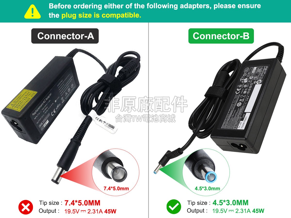 1. 確定自己需要HP 45W 19.5V-2.31A 100-240V~1.5A 50/60HZ變壓器,為避免出錯,可聯絡我們或訂購時填寫設備的型號便於我們判斷您是否購買了正確的變壓器;