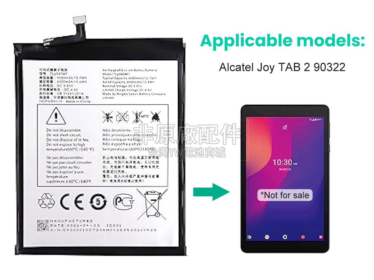 台灣TW電池商城售賣的所有電池均為100%真實容量,我們絕不會在參數上造假。對於製造商提供的每一款電池,我們都會安排技術人員進行參數測試,以確保我們售賣的電池都符合各種認證的要求、100%安全和100%兼容對應的筆記型電腦。極少數情況下,電池參數表上的容量會比電池實物圖上的容量低,這是因為我們檢測時發現製造商給出的電池容量偏高,與電池實際容量不符。於是我們會把電池的實際容量準確地填寫在參數表上,讓顧客直接看到電池的真實容量!這款Alcatel JOY TAB2電池和原廠有什麼區別?
