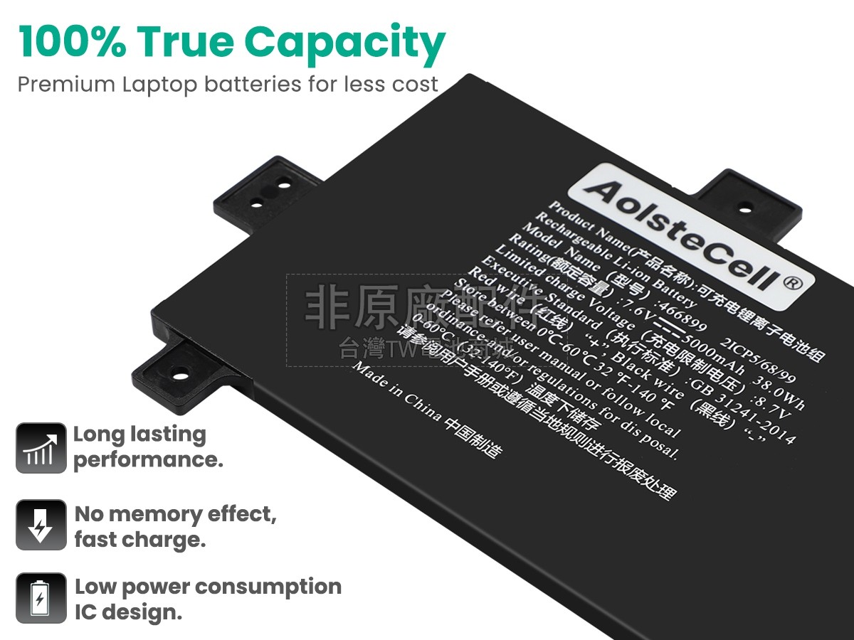 台灣TW電池商城售賣的所有電池均為100%真實容量,我們絕不會在參數上造假。對於製造商提供的每一款電池,我們都會安排技術人員進行參數測試,以確保我們售賣的電池都符合各種認證的要求、100%安全和100%兼容對應的筆記型電腦。極少數情況下,電池參數表上的容量會比電池實物圖上的容量低,這是因為我們檢測時發現製造商給出的電池容量偏高,與電池實際容量不符。於是我們會把電池的實際容量準確地填寫在參數表上,讓顧客直接看到電池的真實容量!這款AolsteCell 466899電池和原廠有什麼區別?