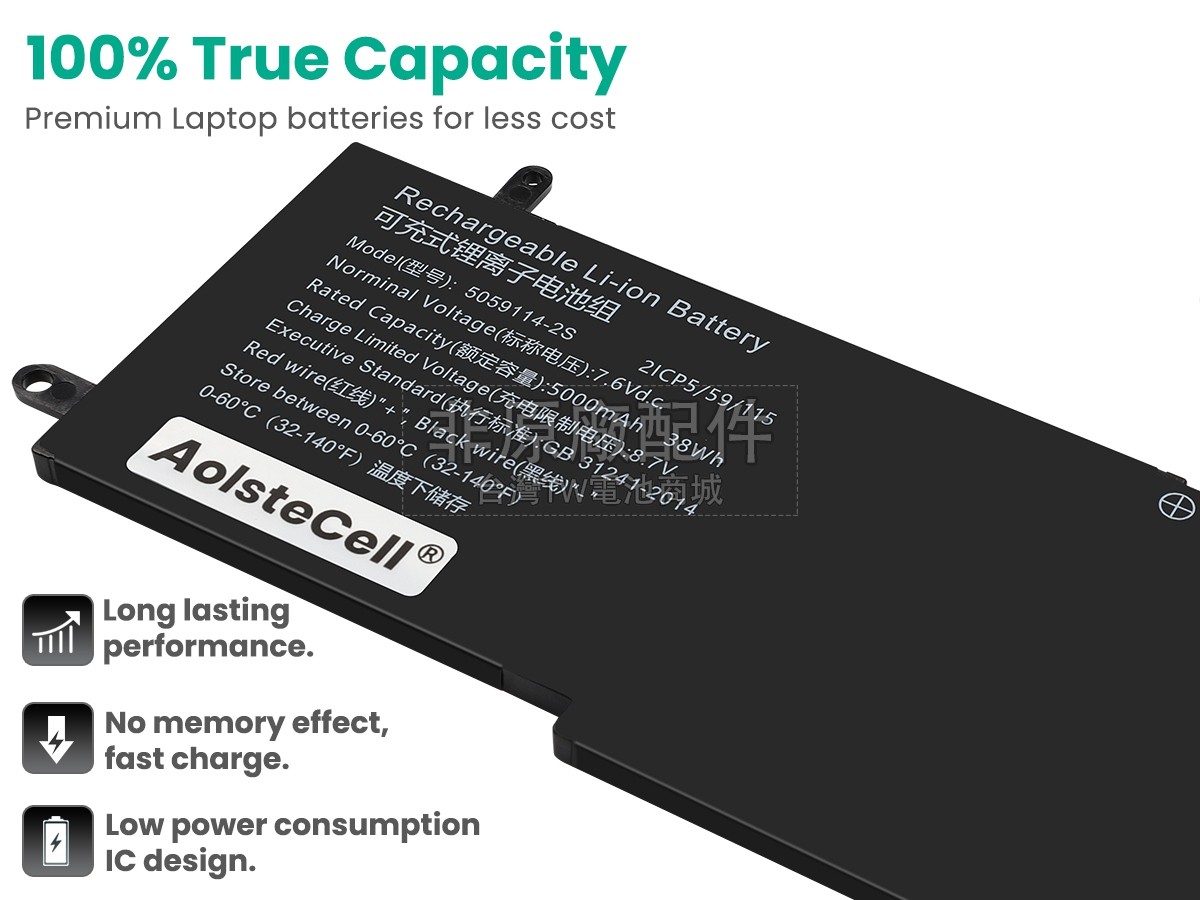 台灣TW電池商城售賣的所有電池均為100%真實容量,我們絕不會在參數上造假。對於製造商提供的每一款電池,我們都會安排技術人員進行參數測試,以確保我們售賣的電池都符合各種認證的要求、100%安全和100%兼容對應的筆記型電腦。極少數情況下,電池參數表上的容量會比電池實物圖上的容量低,這是因為我們檢測時發現製造商給出的電池容量偏高,與電池實際容量不符。於是我們會把電池的實際容量準確地填寫在參數表上,讓顧客直接看到電池的真實容量!這款AolsteCell 5059114-2S電池和原廠有什麼區別?