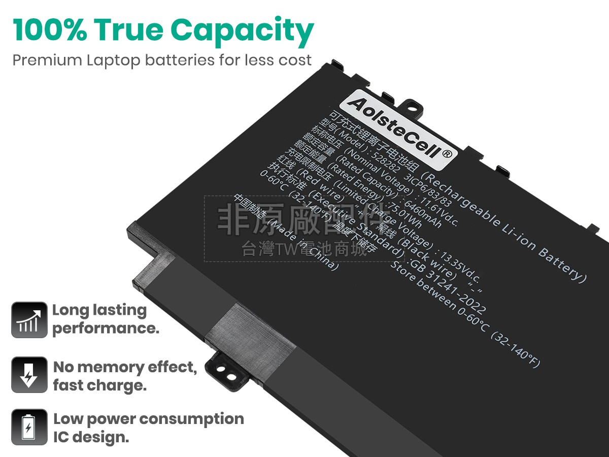 台灣TW電池商城售賣的所有電池均為100%真實容量,我們絕不會在參數上造假。對於製造商提供的每一款電池,我們都會安排技術人員進行參數測試,以確保我們售賣的電池都符合各種認證的要求、100%安全和100%兼容對應的筆記型電腦。極少數情況下,電池參數表上的容量會比電池實物圖上的容量低,這是因為我們檢測時發現製造商給出的電池容量偏高,與電池實際容量不符。於是我們會把電池的實際容量準確地填寫在參數表上,讓顧客直接看到電池的真實容量!這款AolsteCell 528282電池和原廠有什麼區別?