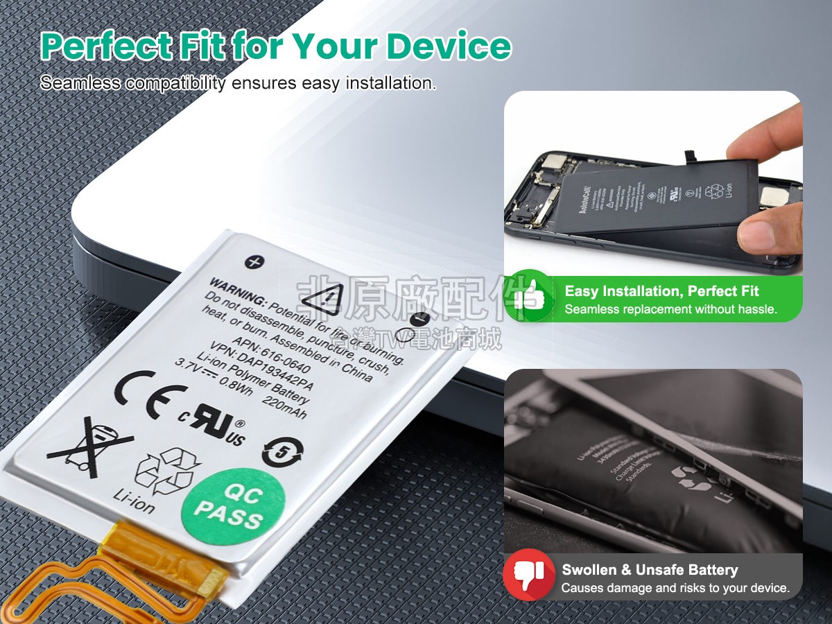 台灣TW電池商城售賣的所有電池均為100%真實容量,我們絕不會在參數上造假。對於製造商提供的每一款電池,我們都會安排技術人員進行參數測試,以確保我們售賣的電池都符合各種認證的要求、100%安全和100%兼容。極少數情況下,電池參數表上的容量會比電池實物圖上的容量低,這是因為我們檢測時發現製造商給出的電池容量偏高,與電池實際容量不符。於是我們會把電池的實際容量準確地填寫在參數表上,讓顧客直接看到電池的真實容量!這款Apple 616-0640電池和原廠有什麼區別?