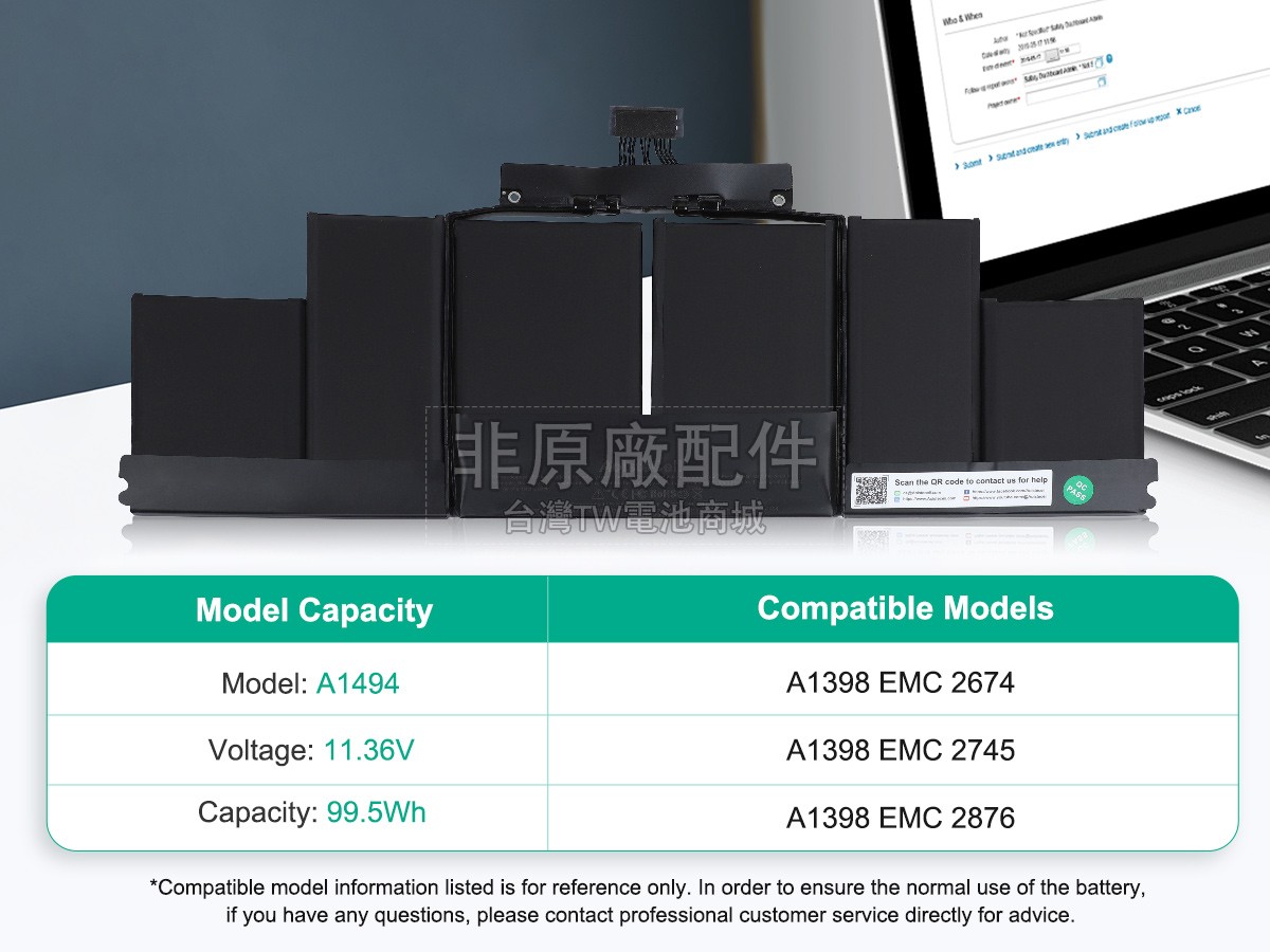 為什麼您應該從我們這裡購買APPLE蘋果A1494電池?電池是一種特殊的消耗品,用料的好壞直接決定了電池的性能和壽命。為了保證顧客良好的使用體驗,我們在這款原廠品質的Apple A1494筆電電池投入了高昂的材料成本,採用全新原廠進口的A+級電芯、美國德州TI芯片和耐高溫抗磨損的ABS+PC合金環保材料,經過100多道安全檢測製造而成。從而保證,這款電池無論在性能、壽命還是安全上都可以滿足您日常休閒、娛樂和辦公的需求。