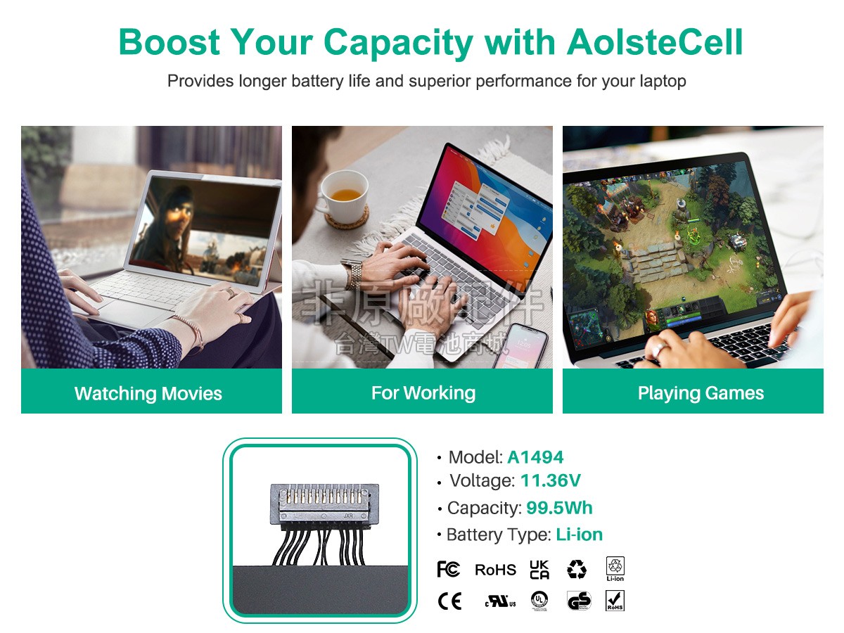 台灣TW電池商城售賣的所有電池均為100%真實容量,我們絕不會在參數上造假。對於製造商提供的每一款電池,我們都會安排技術人員進行參數測試,以確保我們售賣的電池都符合各種認證的要求、100%安全和100%兼容對應的筆記型電腦。極少數情況下,電池參數表上的容量會比電池實物圖上的容量低,這是因為我們檢測時發現製造商給出的電池容量偏高,與電池實際容量不符。於是我們會把電池的實際容量準確地填寫在參數表上,讓顧客直接看到電池的真實容量!這款Apple A1494電池和原廠有什麼區別?