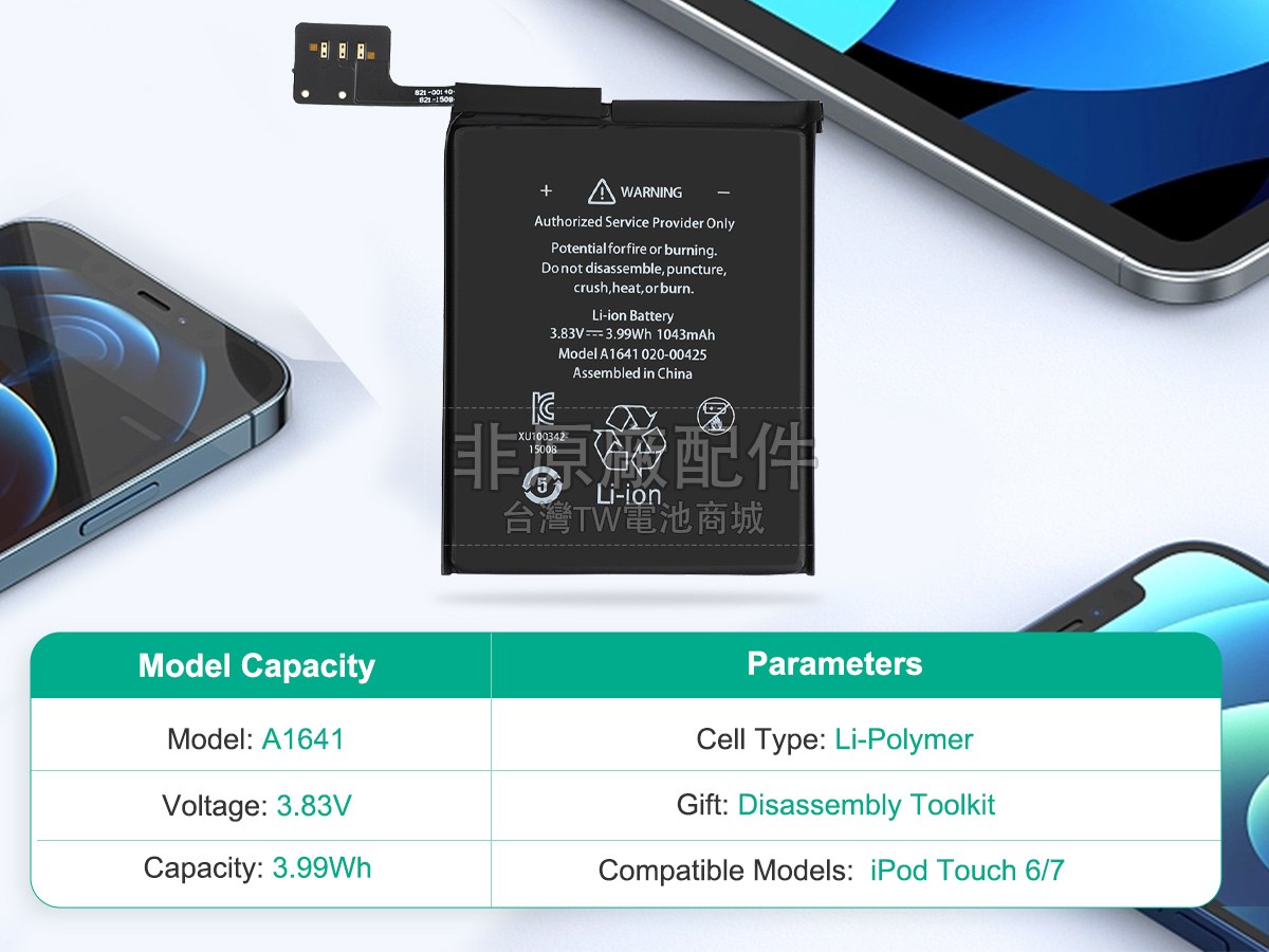 台灣TW電池商城售賣的所有電池均為100%真實容量,我們絕不會在參數上造假。對於製造商提供的每一款電池,我們都會安排技術人員進行參數測試,以確保我們售賣的電池都符合各種認證的要求、100%安全和100%兼容。極少數情況下,電池參數表上的容量會比電池實物圖上的容量低,這是因為我們檢測時發現製造商給出的電池容量偏高,與電池實際容量不符。於是我們會把電池的實際容量準確地填寫在參數表上,讓顧客直接看到電池的真實容量!這款Apple IPOD TOUCH 6TH電池和原廠有什麼區別?