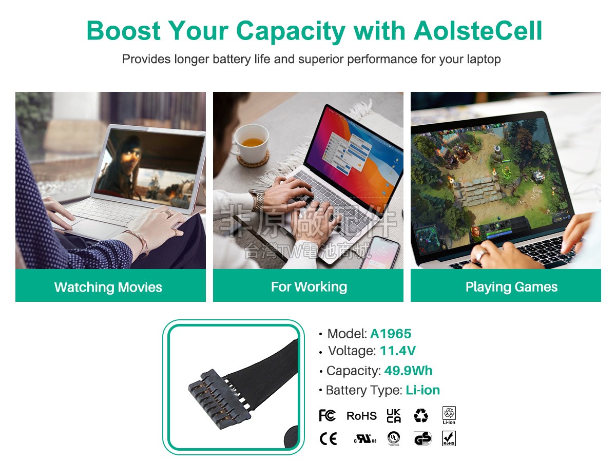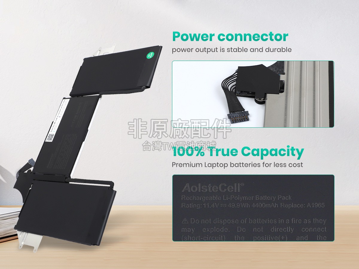 台灣TW電池商城售賣的所有電池均為100%真實容量,我們絕不會在參數上造假。對於製造商提供的每一款電池,我們都會安排技術人員進行參數測試,以確保我們售賣的電池都符合各種認證的要求、100%安全和100%兼容對應的筆記型電腦。極少數情況下,電池參數表上的容量會比電池實物圖上的容量低,這是因為我們檢測時發現製造商給出的電池容量偏高,與電池實際容量不符。於是我們會把電池的實際容量準確地填寫在參數表上,讓顧客直接看到電池的真實容量!這款Apple MacBook Air 13-inch A2179 2020 Year電池和原廠有什麼區別?