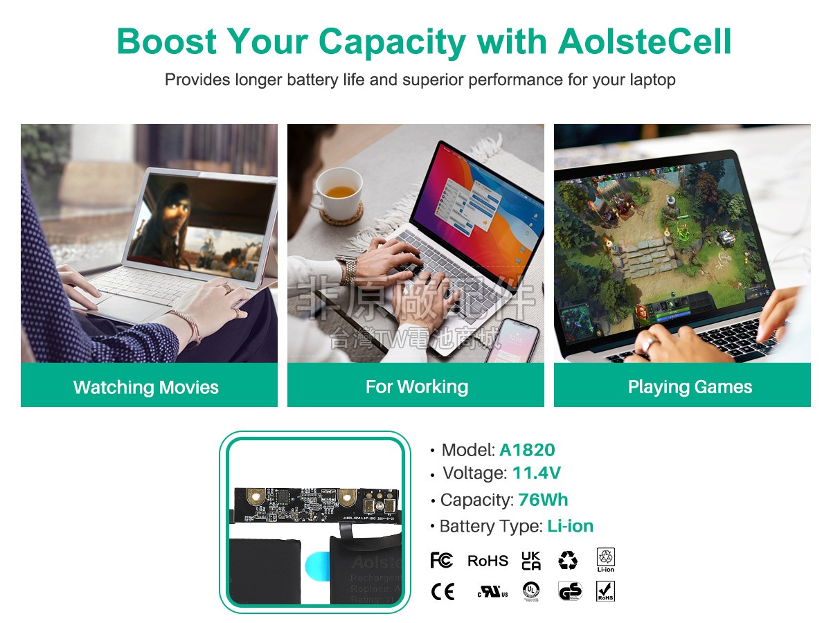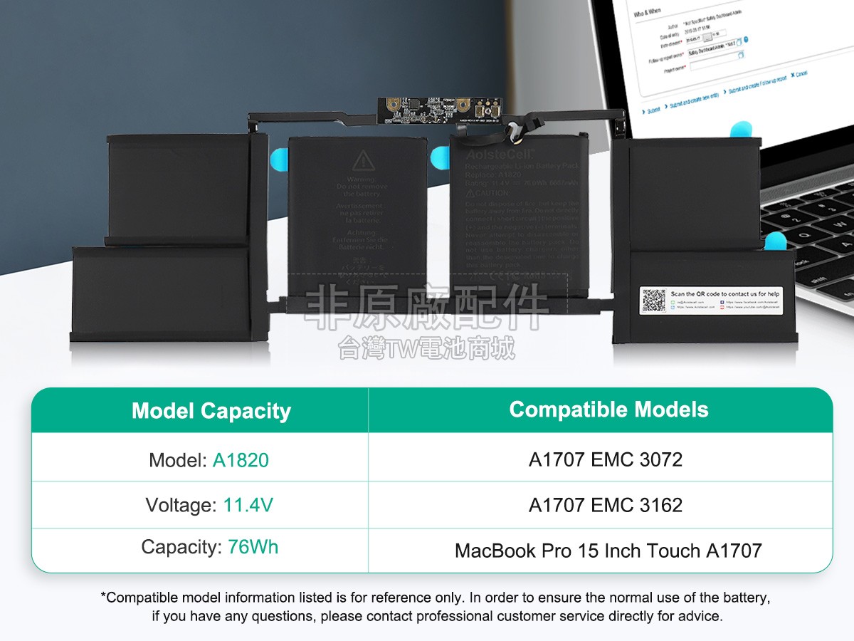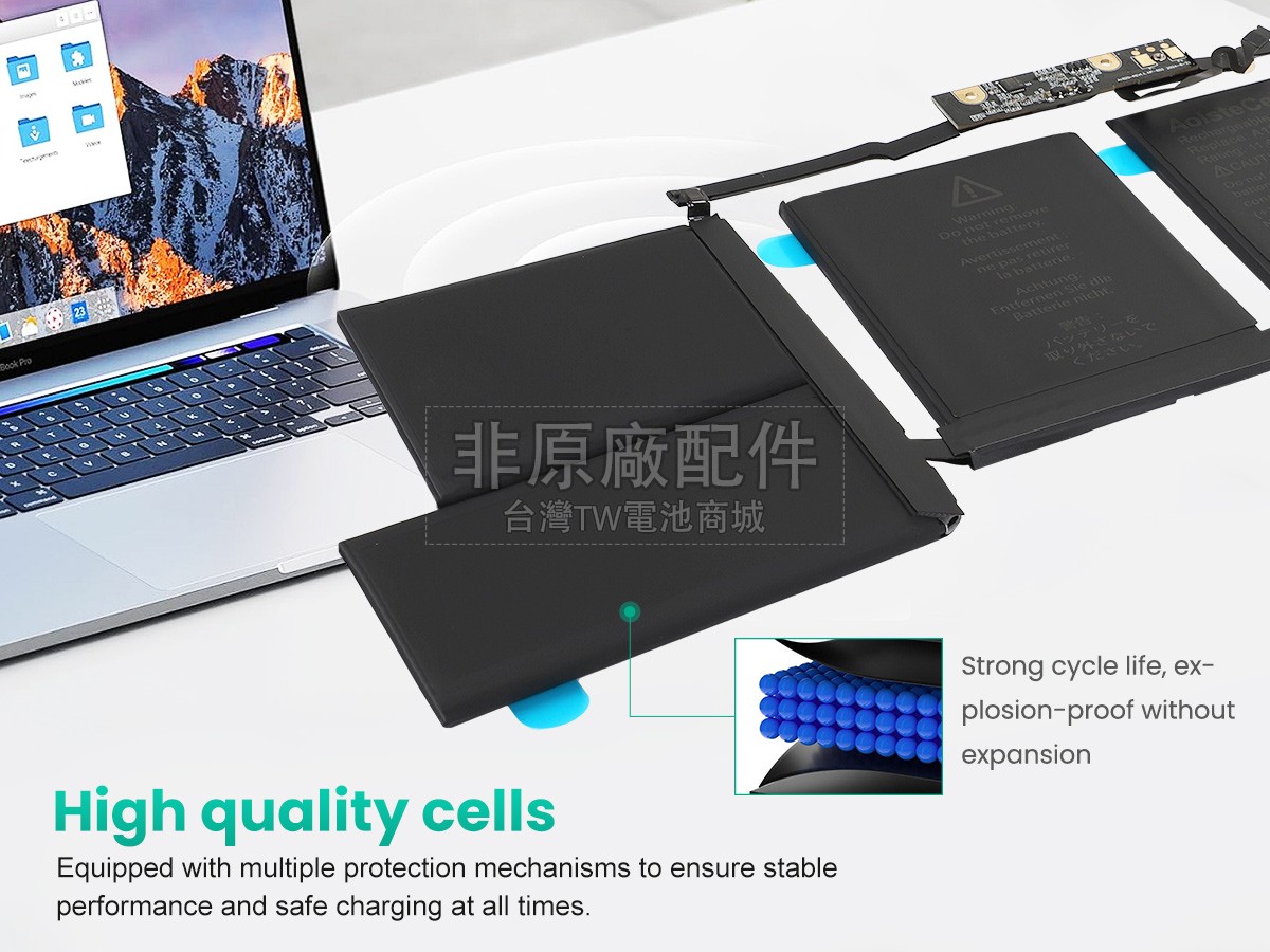台灣TW電池商城售賣的所有電池均為100%真實容量,我們絕不會在參數上造假。對於製造商提供的每一款電池,我們都會安排技術人員進行參數測試,以確保我們售賣的電池都符合各種認證的要求、100%安全和100%兼容對應的筆記型電腦。極少數情況下,電池參數表上的容量會比電池實物圖上的容量低,這是因為我們檢測時發現製造商給出的電池容量偏高,與電池實際容量不符。於是我們會把電池的實際容量準確地填寫在參數表上,讓顧客直接看到電池的真實容量!這款Apple MacBook Pro Core I7 2.9 15 inch TOUCH A1707(Late 2016)電池和原廠有什麼區別?