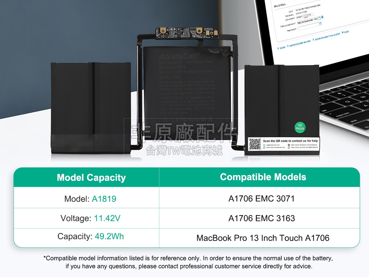 APPLE蘋果MacBook Pro Core I7 3.3 13 inch TOUCH A1706(Late 2016)電池適合的型號並沒有一一列出來,如果您無法確定它是否適合您的設備,可以通過電池鏈接申請頁面請求幫助。