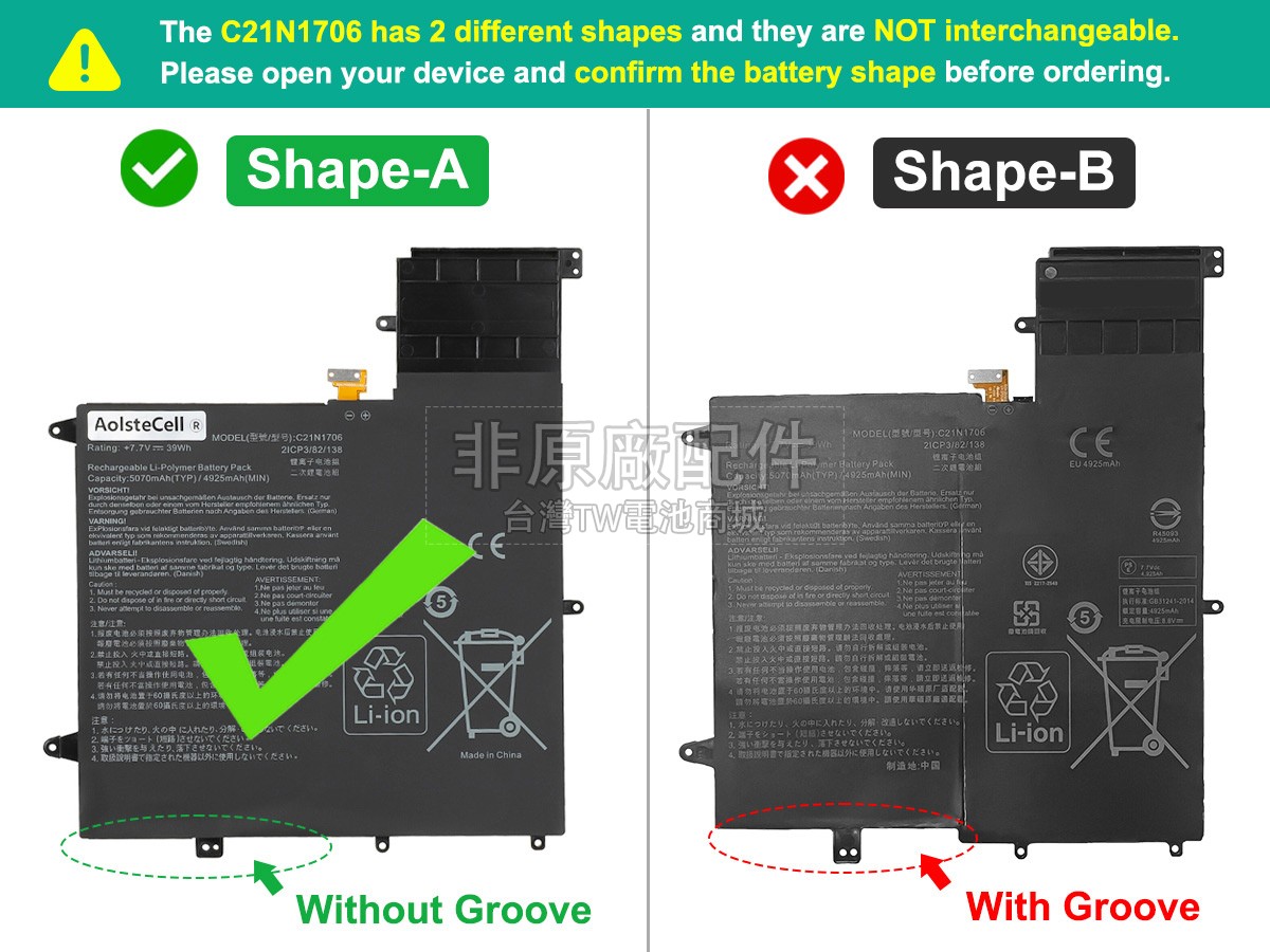 台灣TW電池商城售賣的所有電池均為100%真實容量,我們絕不會在參數上造假。對於製造商提供的每一款電池,我們都會安排技術人員進行參數測試,以確保我們售賣的電池都符合各種認證的要求、100%安全和100%兼容對應的筆記型電腦。極少數情況下,電池參數表上的容量會比電池實物圖上的容量低,這是因為我們檢測時發現製造商給出的電池容量偏高,與電池實際容量不符。於是我們會把電池的實際容量準確地填寫在參數表上,讓顧客直接看到電池的真實容量!這款Asus C21N1706(2ICP3/82/138)電池和原廠有什麼區別?