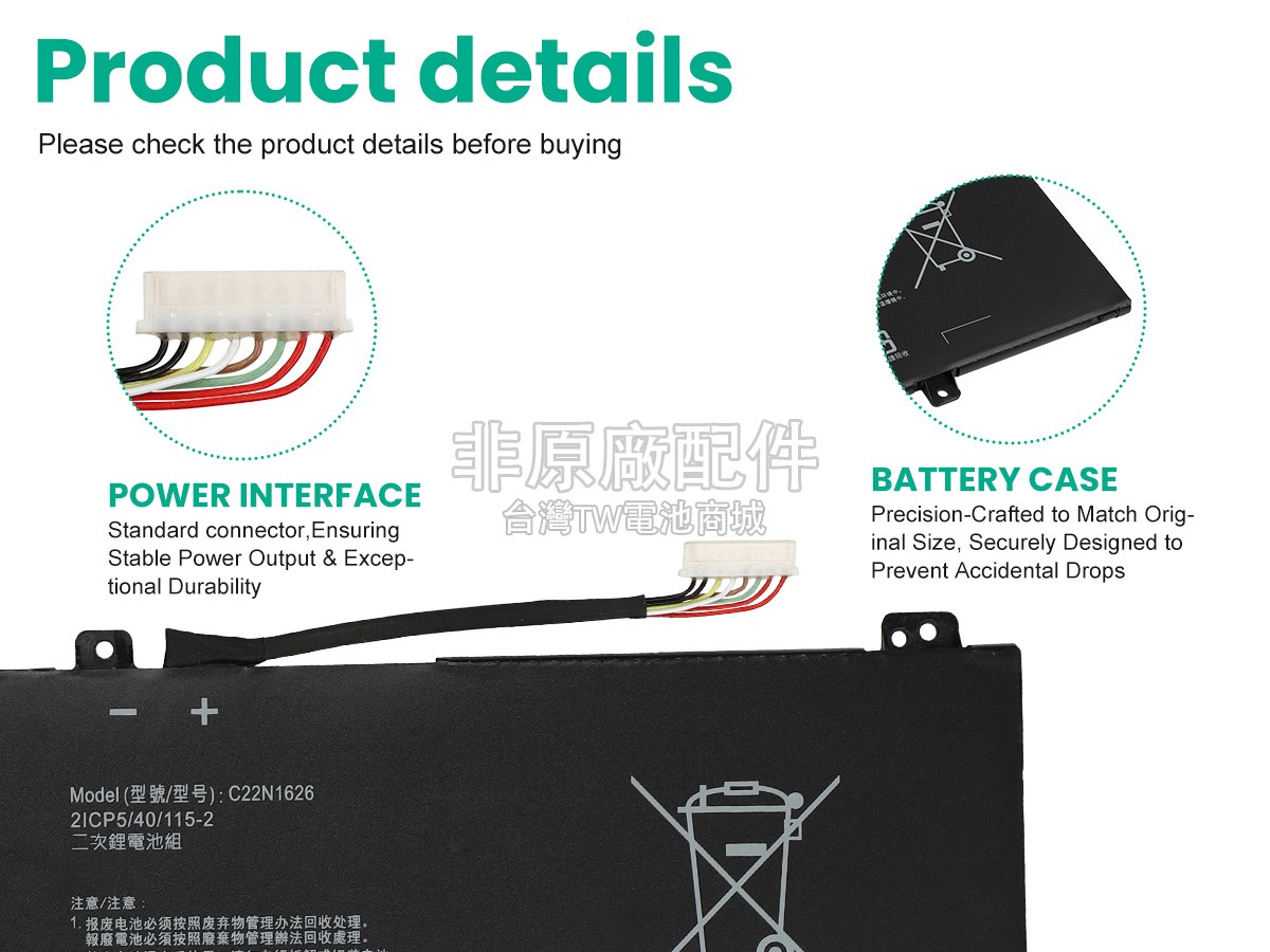 台灣TW電池商城售賣的所有電池均為100%真實容量,我們絕不會在參數上造假。對於製造商提供的每一款電池,我們都會安排技術人員進行參數測試,以確保我們售賣的電池都符合各種認證的要求、100%安全和100%兼容對應的筆記型電腦。極少數情況下,電池參數表上的容量會比電池實物圖上的容量低,這是因為我們檢測時發現製造商給出的電池容量偏高,與電池實際容量不符。於是我們會把電池的實際容量準確地填寫在參數表上,讓顧客直接看到電池的真實容量!這款Asus Chromebook Flip C213NA-BW0040電池和原廠有什麼區別?