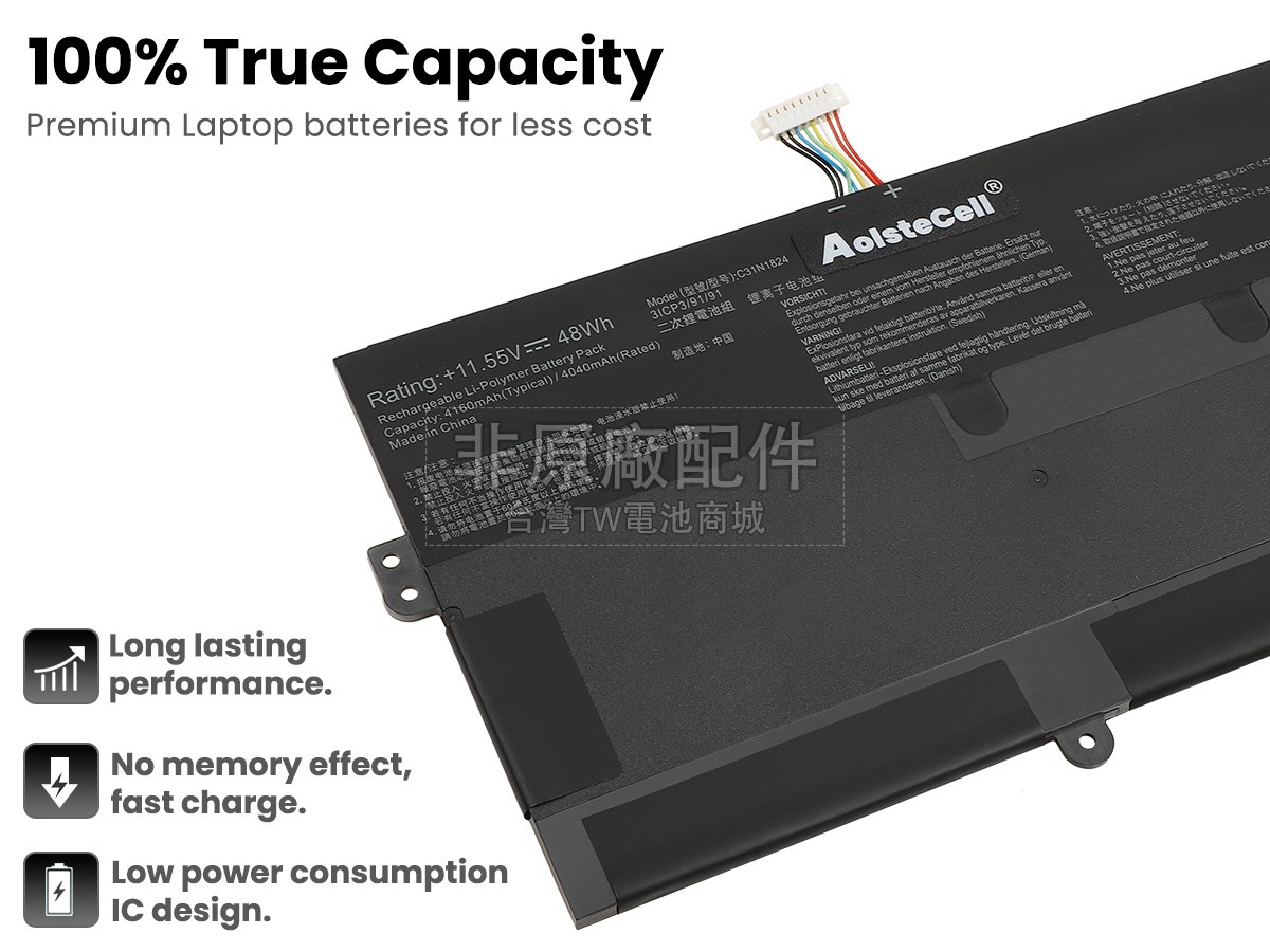 台灣TW電池商城售賣的所有電池均為100%真實容量,我們絕不會在參數上造假。對於製造商提供的每一款電池,我們都會安排技術人員進行參數測試,以確保我們售賣的電池都符合各種認證的要求、100%安全和100%兼容對應的筆記型電腦。極少數情況下,電池參數表上的容量會比電池實物圖上的容量低,這是因為我們檢測時發現製造商給出的電池容量偏高,與電池實際容量不符。於是我們會把電池的實際容量準確地填寫在參數表上,讓顧客直接看到電池的真實容量!這款Asus Chromebook Flip C434TA-AIZ032電池和原廠有什麼區別?