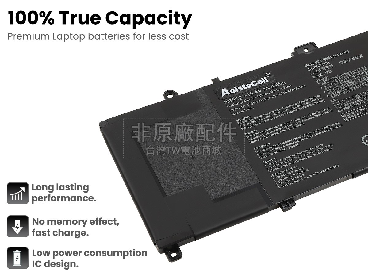 台灣TW電池商城售賣的所有電池均為100%真實容量,我們絕不會在參數上造假。對於製造商提供的每一款電池,我們都會安排技術人員進行參數測試,以確保我們售賣的電池都符合各種認證的要求、100%安全和100%兼容對應的筆記型電腦。極少數情況下,電池參數表上的容量會比電池實物圖上的容量低,這是因為我們檢測時發現製造商給出的電池容量偏高,與電池實際容量不符。於是我們會把電池的實際容量準確地填寫在參數表上,讓顧客直接看到電池的真實容量!這款Asus EXPERTBook B9 B9450CEA電池和原廠有什麼區別?
