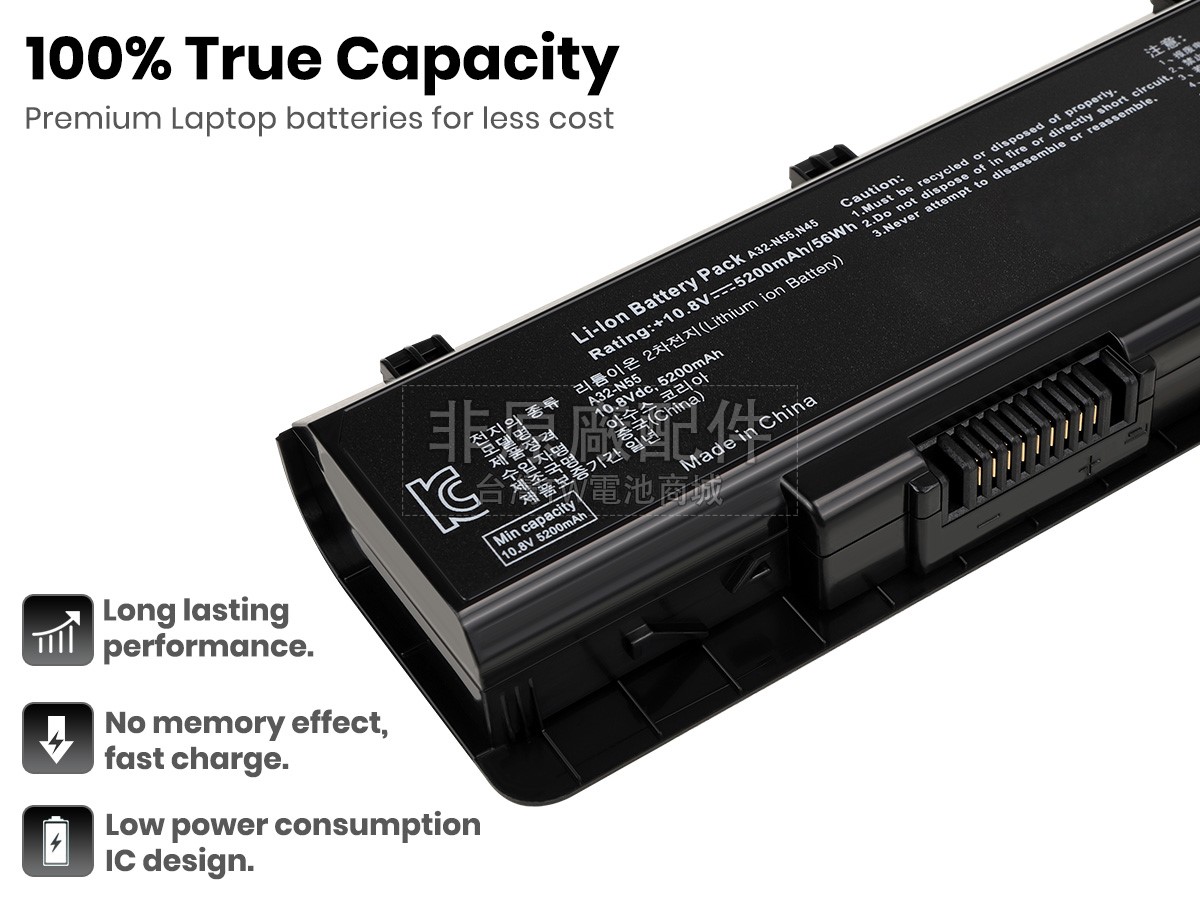 台灣TW電池商城售賣的所有電池均為100%真實容量,我們絕不會在參數上造假。對於製造商提供的每一款電池,我們都會安排技術人員進行參數測試,以確保我們售賣的電池都符合各種認證的要求、100%安全和100%兼容對應的筆記型電腦。極少數情況下,電池參數表上的容量會比電池實物圖上的容量低,這是因為我們檢測時發現製造商給出的電池容量偏高,與電池實際容量不符。於是我們會把電池的實際容量準確地填寫在參數表上,讓顧客直接看到電池的真實容量!這款Asus N75S電池和原廠有什麼區別?