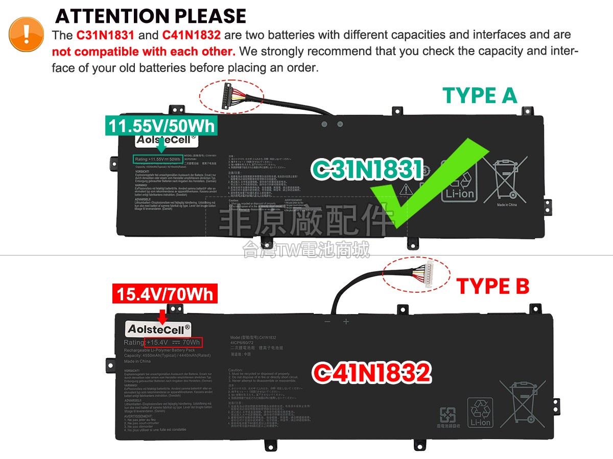 台灣TW電池商城售賣的所有電池均為100%真實容量,我們絕不會在參數上造假。對於製造商提供的每一款電池,我們都會安排技術人員進行參數測試,以確保我們售賣的電池都符合各種認證的要求、100%安全和100%兼容對應的筆記型電腦。極少數情況下,電池參數表上的容量會比電池實物圖上的容量低,這是因為我們檢測時發現製造商給出的電池容量偏高,與電池實際容量不符。於是我們會把電池的實際容量準確地填寫在參數表上,讓顧客直接看到電池的真實容量!這款Asus P3540FB電池和原廠有什麼區別?