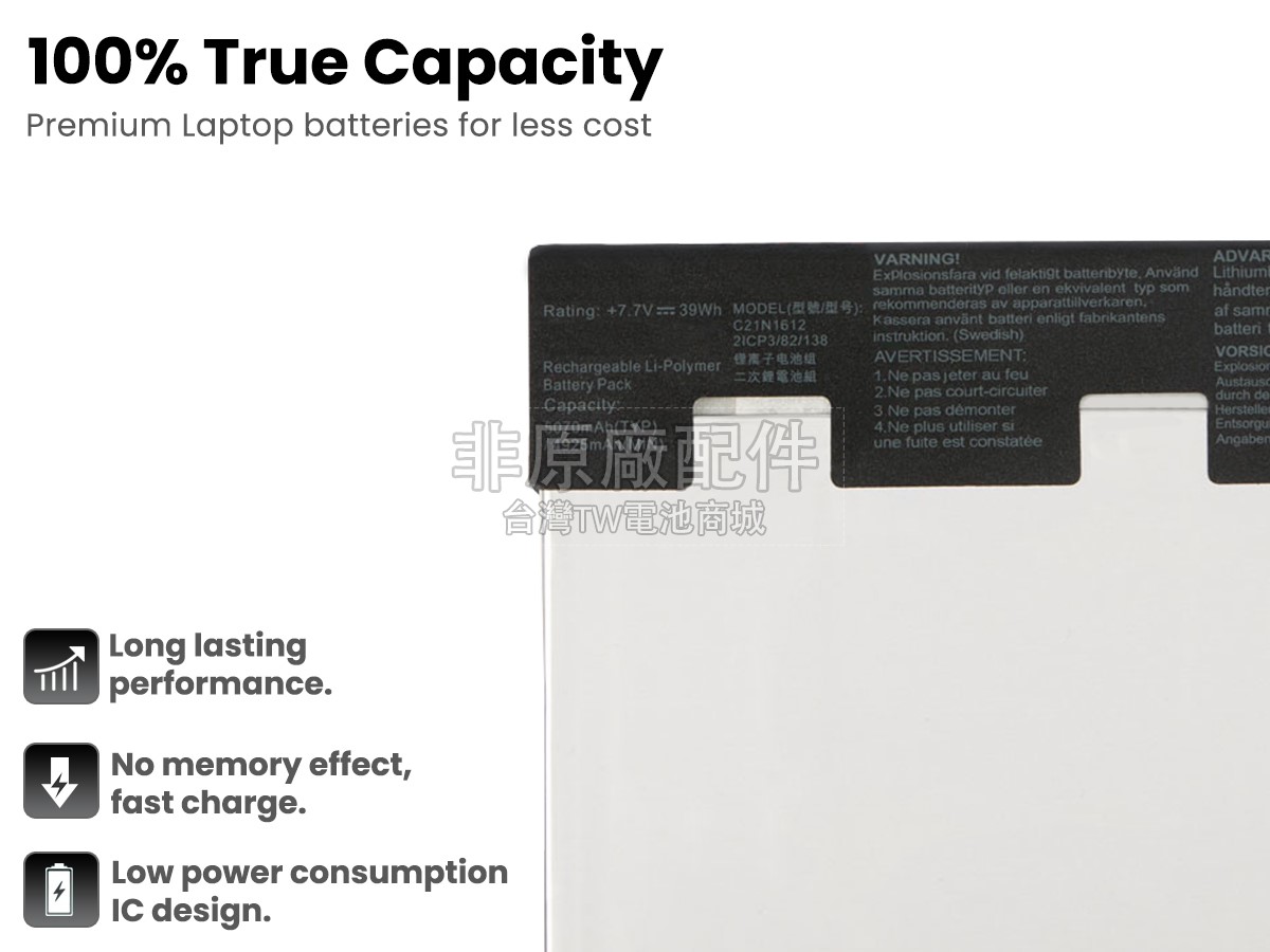 台灣TW電池商城售賣的所有電池均為100%真實容量,我們絕不會在參數上造假。對於製造商提供的每一款電池,我們都會安排技術人員進行參數測試,以確保我們售賣的電池都符合各種認證的要求、100%安全和100%兼容對應的筆記型電腦。極少數情況下,電池參數表上的容量會比電池實物圖上的容量低,這是因為我們檢測時發現製造商給出的電池容量偏高,與電池實際容量不符。於是我們會把電池的實際容量準確地填寫在參數表上,讓顧客直接看到電池的真實容量!這款Asus Transformer 3 T305CA-GW033R電池和原廠有什麼區別?