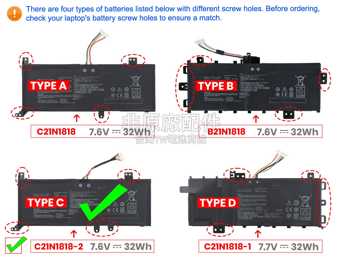 ASUS華碩VivoBook 15 X515EA-EJ322T電池適合的型號並沒有一一列出來,如果您無法確定它是否適合您的設備,可以通過電池鏈接申請頁面請求幫助。