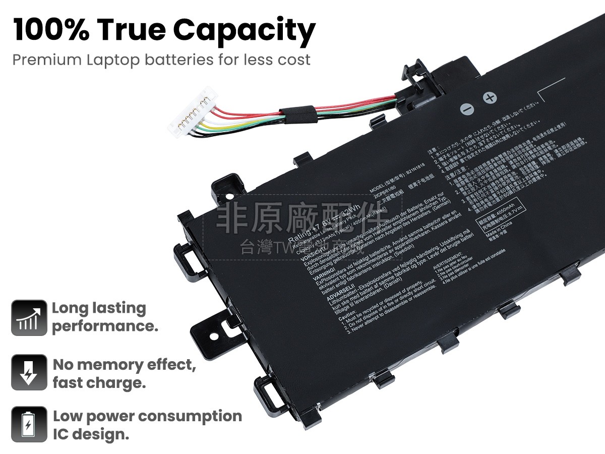 台灣TW電池商城售賣的所有電池均為100%真實容量,我們絕不會在參數上造假。對於製造商提供的每一款電池,我們都會安排技術人員進行參數測試,以確保我們售賣的電池都符合各種認證的要求、100%安全和100%兼容對應的筆記型電腦。極少數情況下,電池參數表上的容量會比電池實物圖上的容量低,這是因為我們檢測時發現製造商給出的電池容量偏高,與電池實際容量不符。於是我們會把電池的實際容量準確地填寫在參數表上,讓顧客直接看到電池的真實容量!這款Asus VivoBook 17 X712EA-MS72-C電池和原廠有什麼區別?
