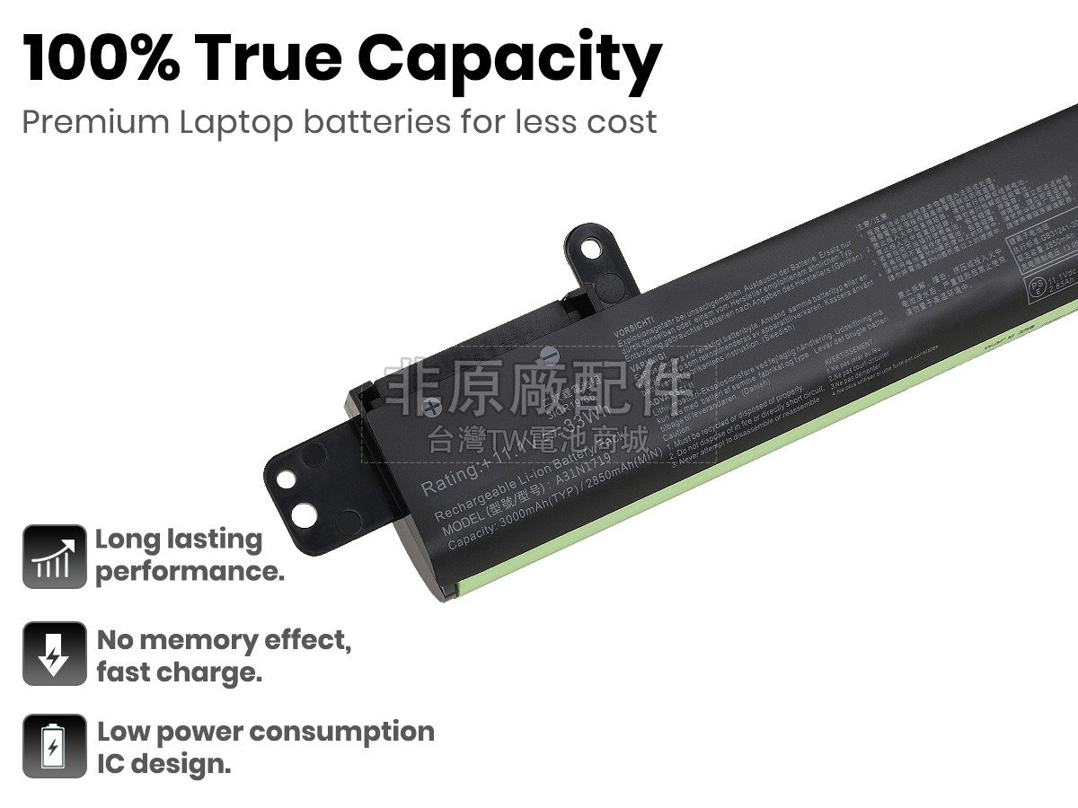 台灣TW電池商城售賣的所有電池均為100%真實容量,我們絕不會在參數上造假。對於製造商提供的每一款電池,我們都會安排技術人員進行參數測試,以確保我們售賣的電池都符合各種認證的要求、100%安全和100%兼容對應的筆記型電腦。極少數情況下,電池參數表上的容量會比電池實物圖上的容量低,這是因為我們檢測時發現製造商給出的電池容量偏高,與電池實際容量不符。於是我們會把電池的實際容量準確地填寫在參數表上,讓顧客直接看到電池的真實容量!這款Asus VivoBook F407MA-EB077T電池和原廠有什麼區別?