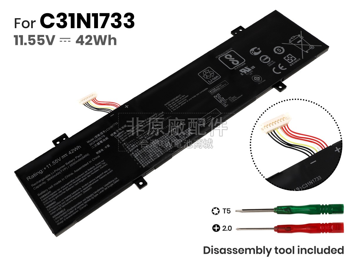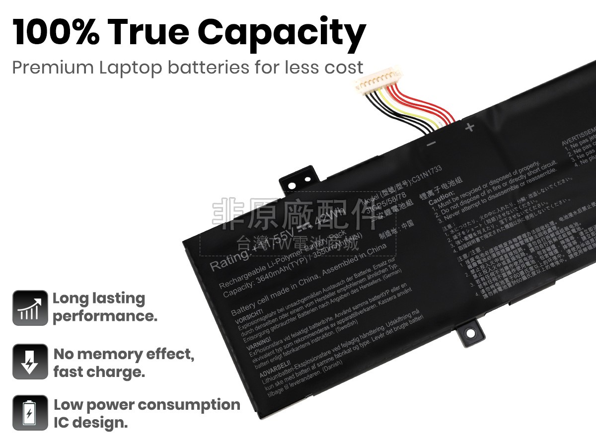 台灣TW電池商城售賣的所有電池均為100%真實容量,我們絕不會在參數上造假。對於製造商提供的每一款電池,我們都會安排技術人員進行參數測試,以確保我們售賣的電池都符合各種認證的要求、100%安全和100%兼容對應的筆記型電腦。極少數情況下,電池參數表上的容量會比電池實物圖上的容量低,這是因為我們檢測時發現製造商給出的電池容量偏高,與電池實際容量不符。於是我們會把電池的實際容量準確地填寫在參數表上,讓顧客直接看到電池的真實容量!這款Asus VivoBook Flip 14 TP412FA-EC224T電池和原廠有什麼區別?