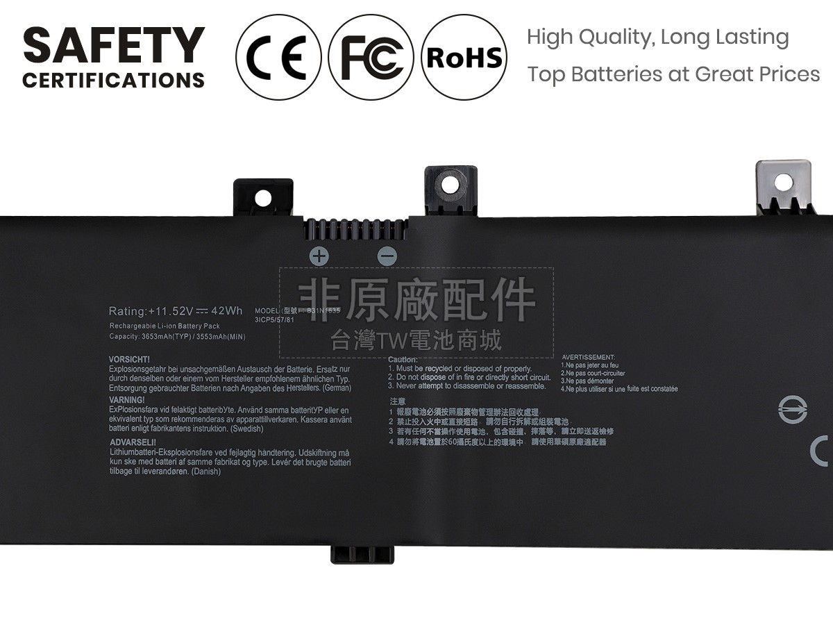 台灣TW電池商城售賣的所有電池均為100%真實容量,我們絕不會在參數上造假。對於製造商提供的每一款電池,我們都會安排技術人員進行參數測試,以確保我們售賣的電池都符合各種認證的要求、100%安全和100%兼容對應的筆記型電腦。極少數情況下,電池參數表上的容量會比電池實物圖上的容量低,這是因為我們檢測時發現製造商給出的電池容量偏高,與電池實際容量不符。於是我們會把電池的實際容量準確地填寫在參數表上,讓顧客直接看到電池的真實容量!這款Asus VivoBook N705UQ電池和原廠有什麼區別?