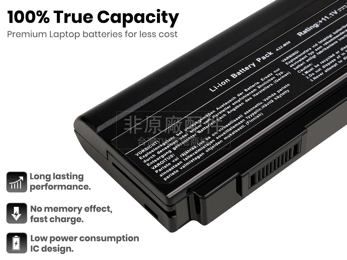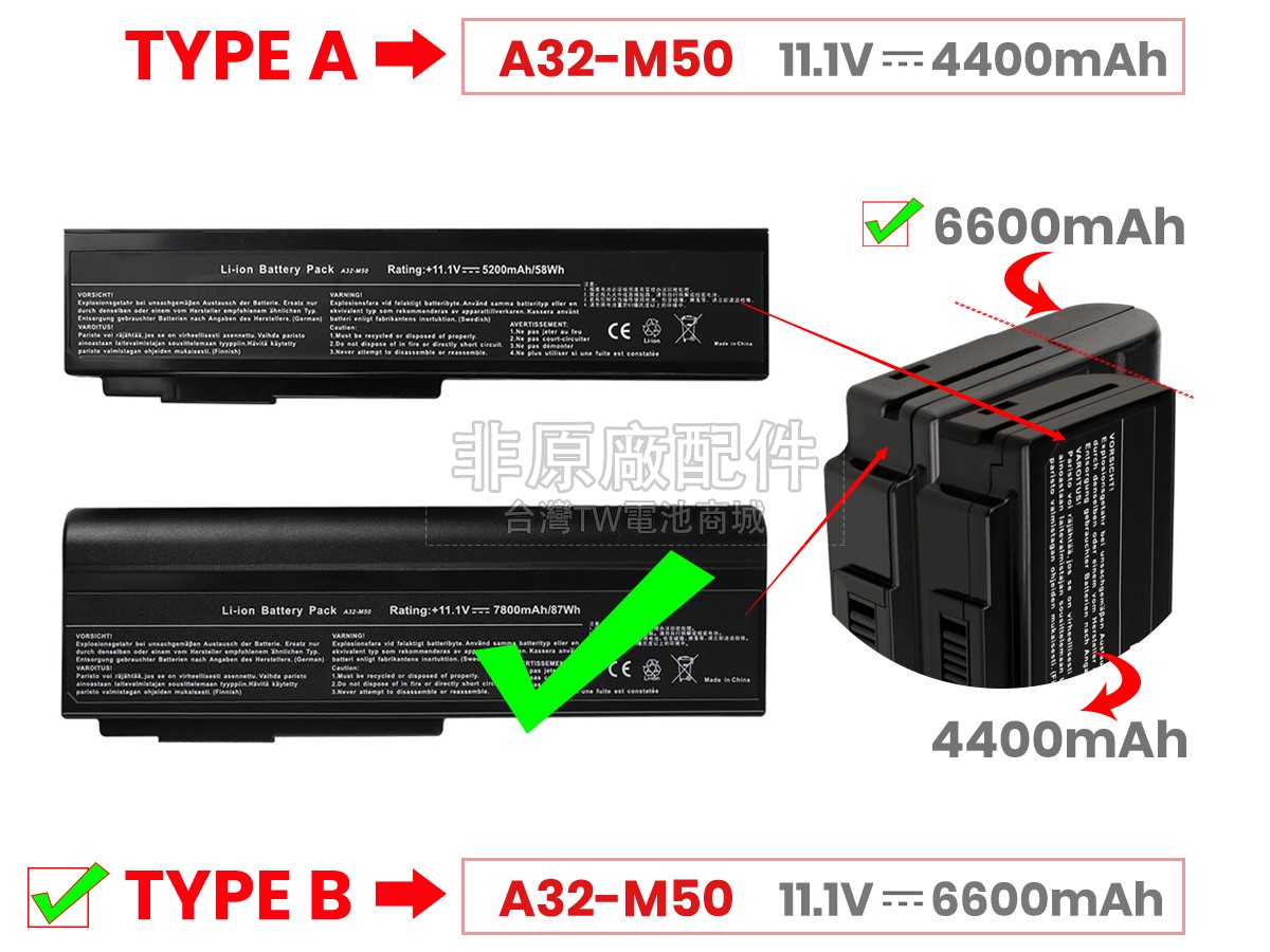 台灣TW電池商城售賣的所有電池均為100%真實容量,我們絕不會在參數上造假。對於製造商提供的每一款電池,我們都會安排技術人員進行參數測試,以確保我們售賣的電池都符合各種認證的要求、100%安全和100%兼容對應的筆記型電腦。極少數情況下,電池參數表上的容量會比電池實物圖上的容量低,這是因為我們檢測時發現製造商給出的電池容量偏高,與電池實際容量不符。於是我們會把電池的實際容量準確地填寫在參數表上,讓顧客直接看到電池的真實容量!這款Asus VX5電池和原廠有什麼區別?
