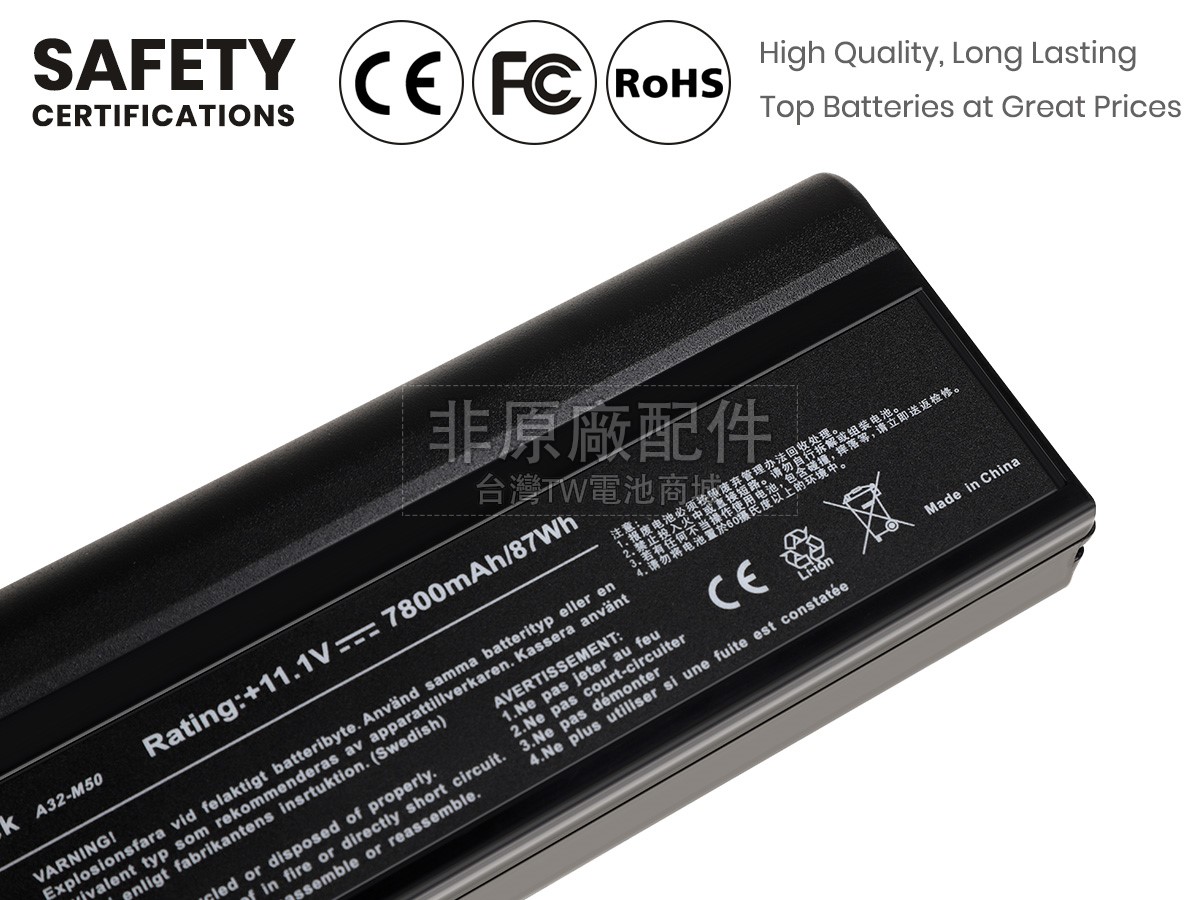除了使用好的材料外,TW電池商城還以更高的行業標準檢測產品,目前我們的Asus VX5手提電腦電池已經通過日本PSE強制認證、歐盟RoHS環保認證、CE安全認證、美國FCC認證和MSDS化學品安全認證。
