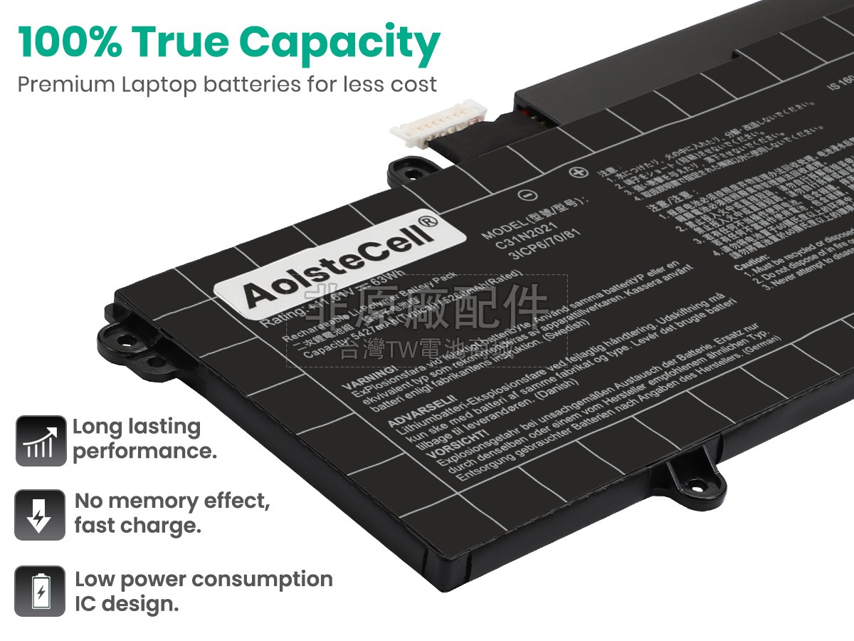 台灣TW電池商城售賣的所有電池均為100%真實容量,我們絕不會在參數上造假。對於製造商提供的每一款電池,我們都會安排技術人員進行參數測試,以確保我們售賣的電池都符合各種認證的要求、100%安全和100%兼容對應的筆記型電腦。極少數情況下,電池參數表上的容量會比電池實物圖上的容量低,這是因為我們檢測時發現製造商給出的電池容量偏高,與電池實際容量不符。於是我們會把電池的實際容量準確地填寫在參數表上,讓顧客直接看到電池的真實容量!這款Asus ZenBook 14X OLED A5400EG-KN214R電池和原廠有什麼區別?