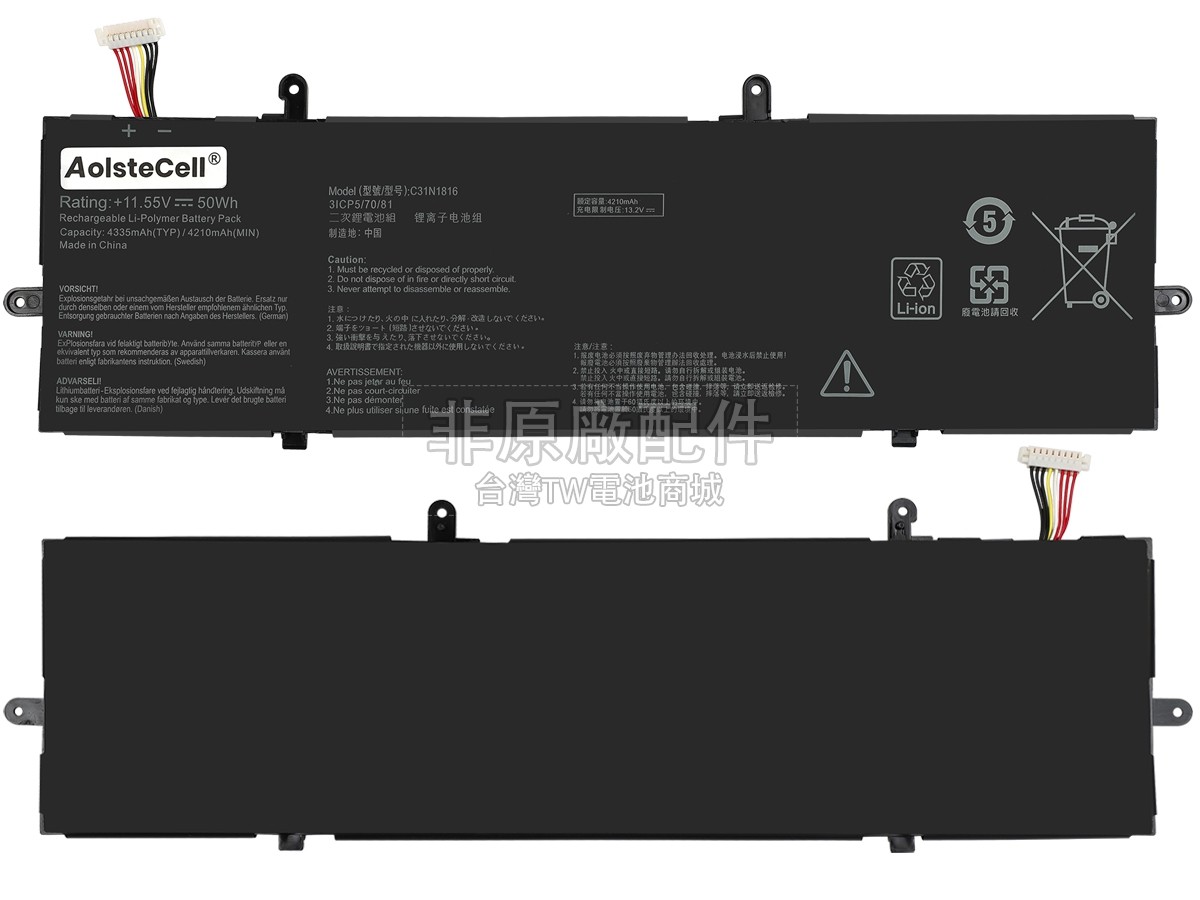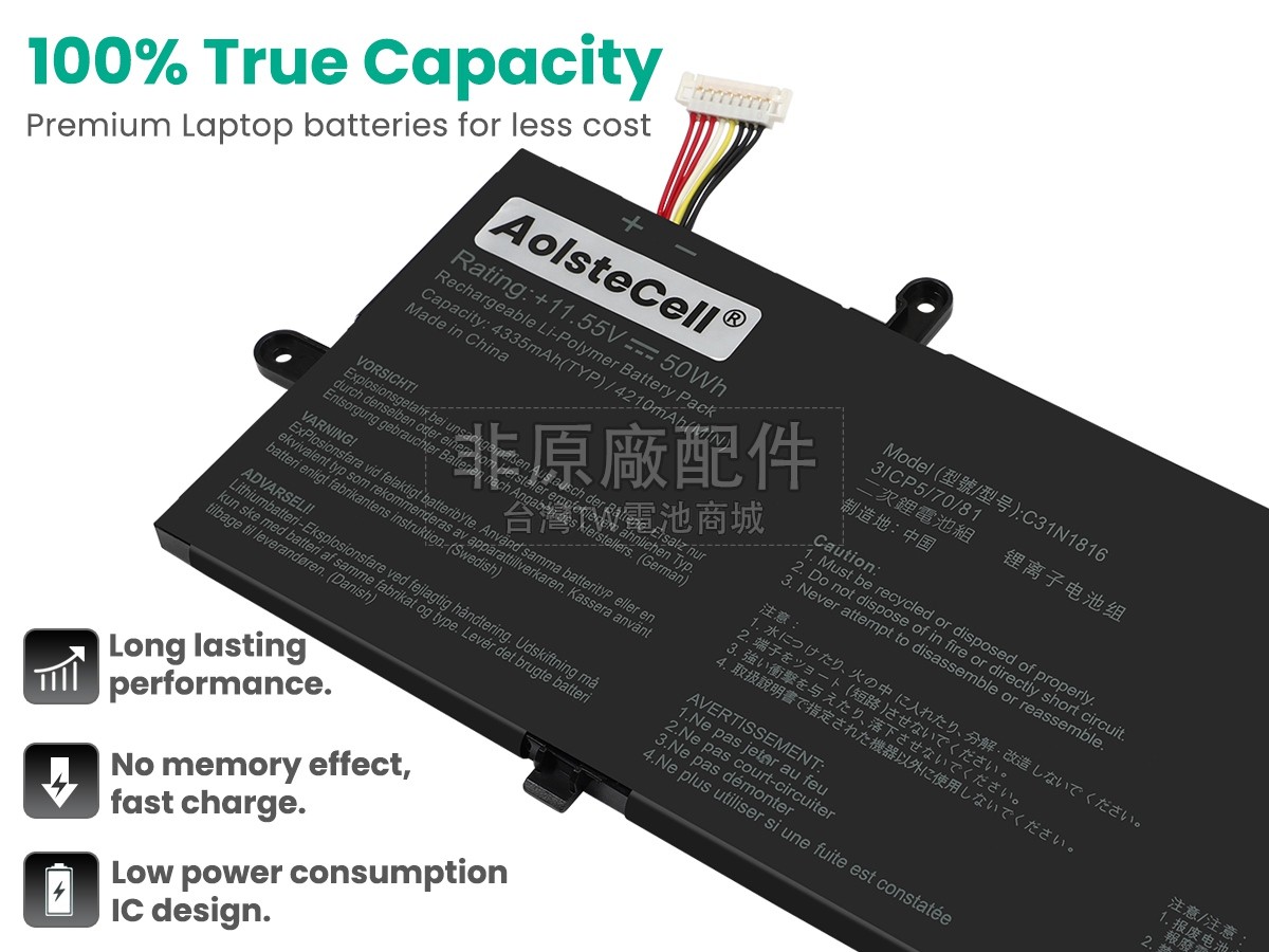 台灣TW電池商城售賣的所有電池均為100%真實容量,我們絕不會在參數上造假。對於製造商提供的每一款電池,我們都會安排技術人員進行參數測試,以確保我們售賣的電池都符合各種認證的要求、100%安全和100%兼容對應的筆記型電腦。極少數情況下,電池參數表上的容量會比電池實物圖上的容量低,這是因為我們檢測時發現製造商給出的電池容量偏高,與電池實際容量不符。於是我們會把電池的實際容量準確地填寫在參數表上,讓顧客直接看到電池的真實容量!這款Asus ZenBook Flip UX362FA-EL302T電池和原廠有什麼區別?