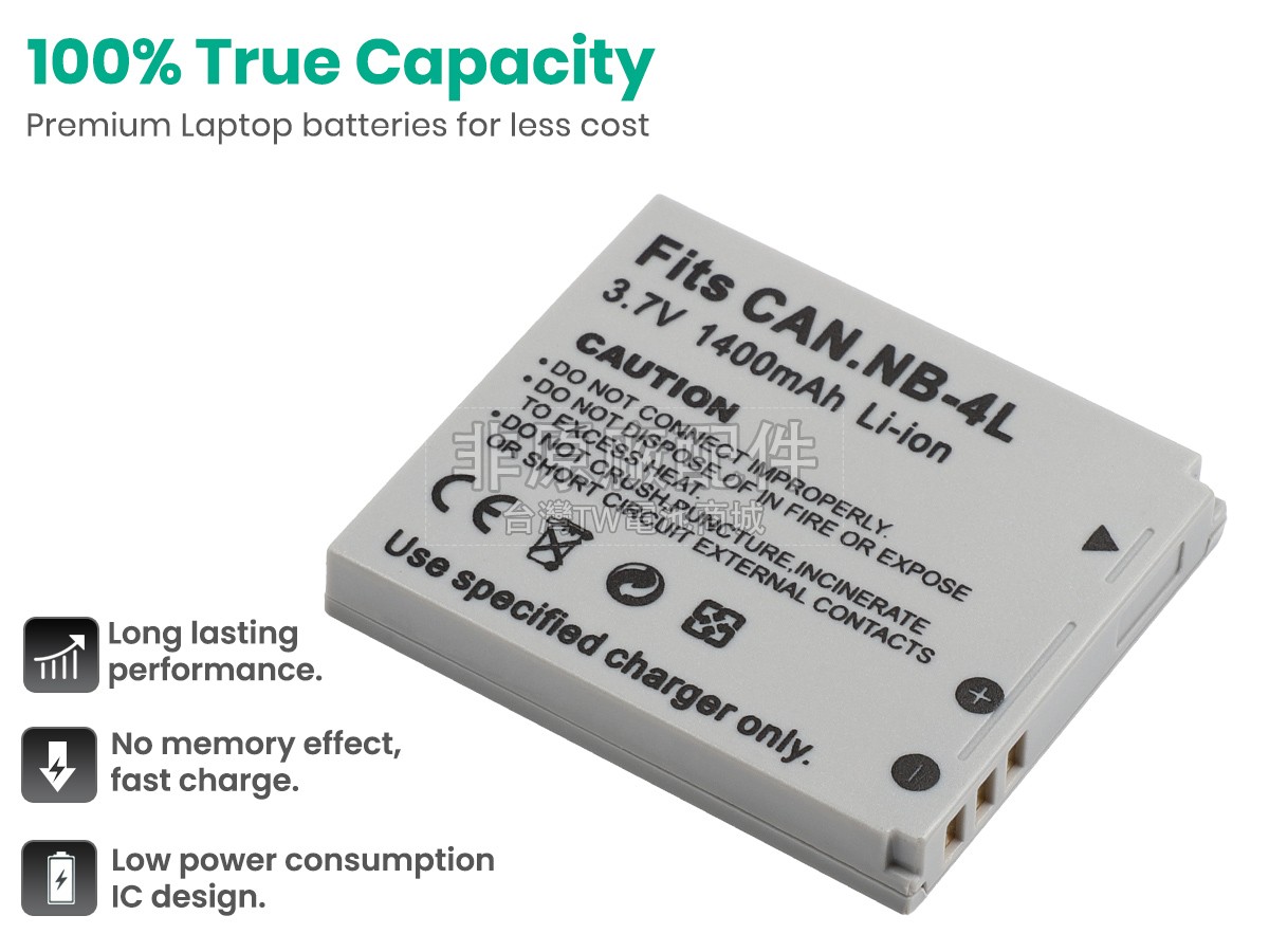 台灣TW電池商城售賣的所有電池均為100%真實容量,我們絕不會在參數上造假。對於製造商提供的每一款電池,我們都會安排技術人員進行參數測試,以確保我們售賣的電池都符合各種認證的要求、100%安全和100%兼容。極少數情況下,電池參數表上的容量會比電池實物圖上的容量低,這是因為我們檢測時發現製造商給出的電池容量偏高,與電池實際容量不符。於是我們會把電池的實際容量準確地填寫在參數表上,讓顧客直接看到電池的真實容量!這款Canon IXUS 40電池和原廠有什麼區別?