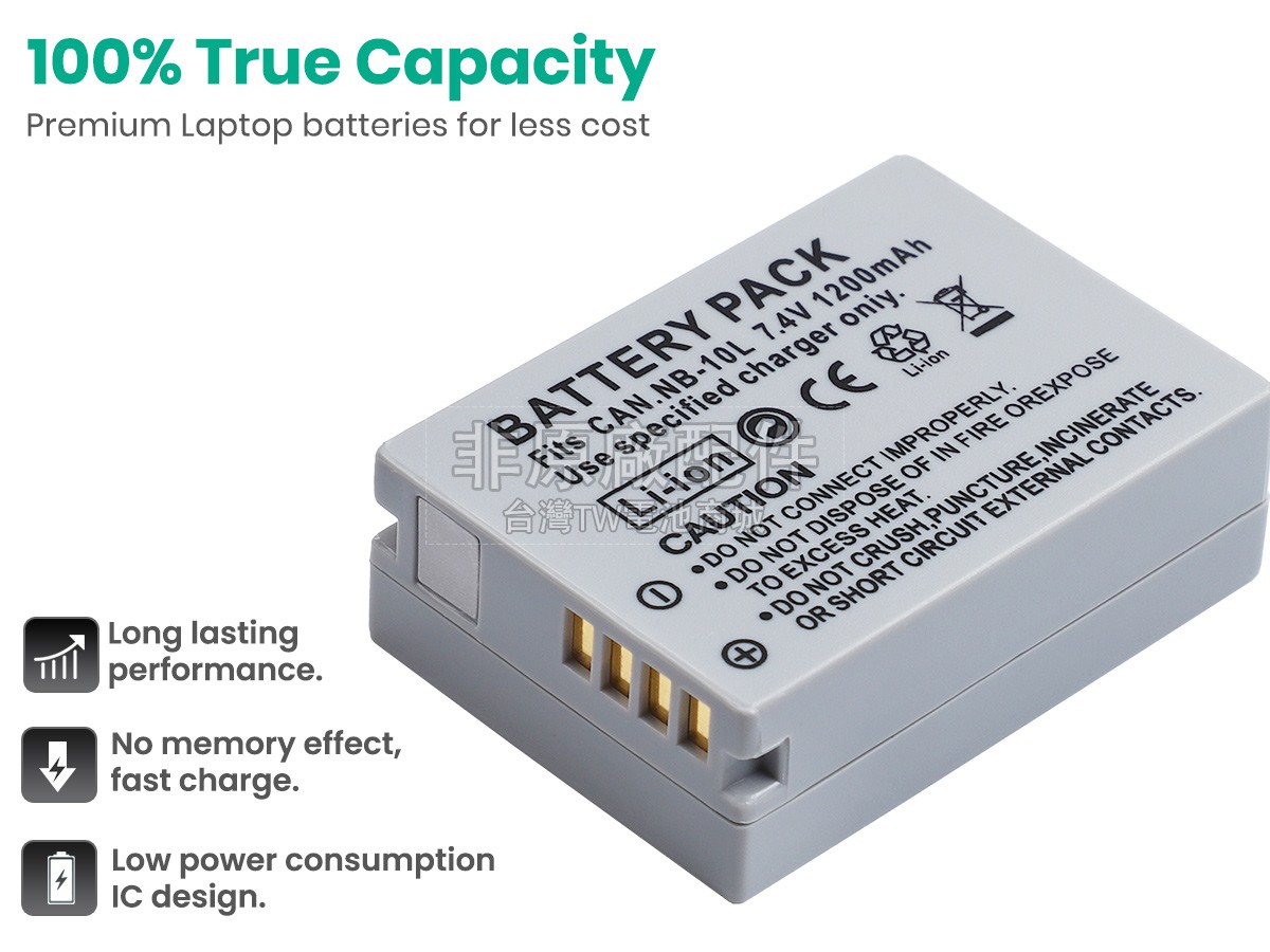 台灣TW電池商城售賣的所有電池均為100%真實容量,我們絕不會在參數上造假。對於製造商提供的每一款電池,我們都會安排技術人員進行參數測試,以確保我們售賣的電池都符合各種認證的要求、100%安全和100%兼容。極少數情況下,電池參數表上的容量會比電池實物圖上的容量低,這是因為我們檢測時發現製造商給出的電池容量偏高,與電池實際容量不符。於是我們會把電池的實際容量準確地填寫在參數表上,讓顧客直接看到電池的真實容量!這款Canon NB-10L電池和原廠有什麼區別?
