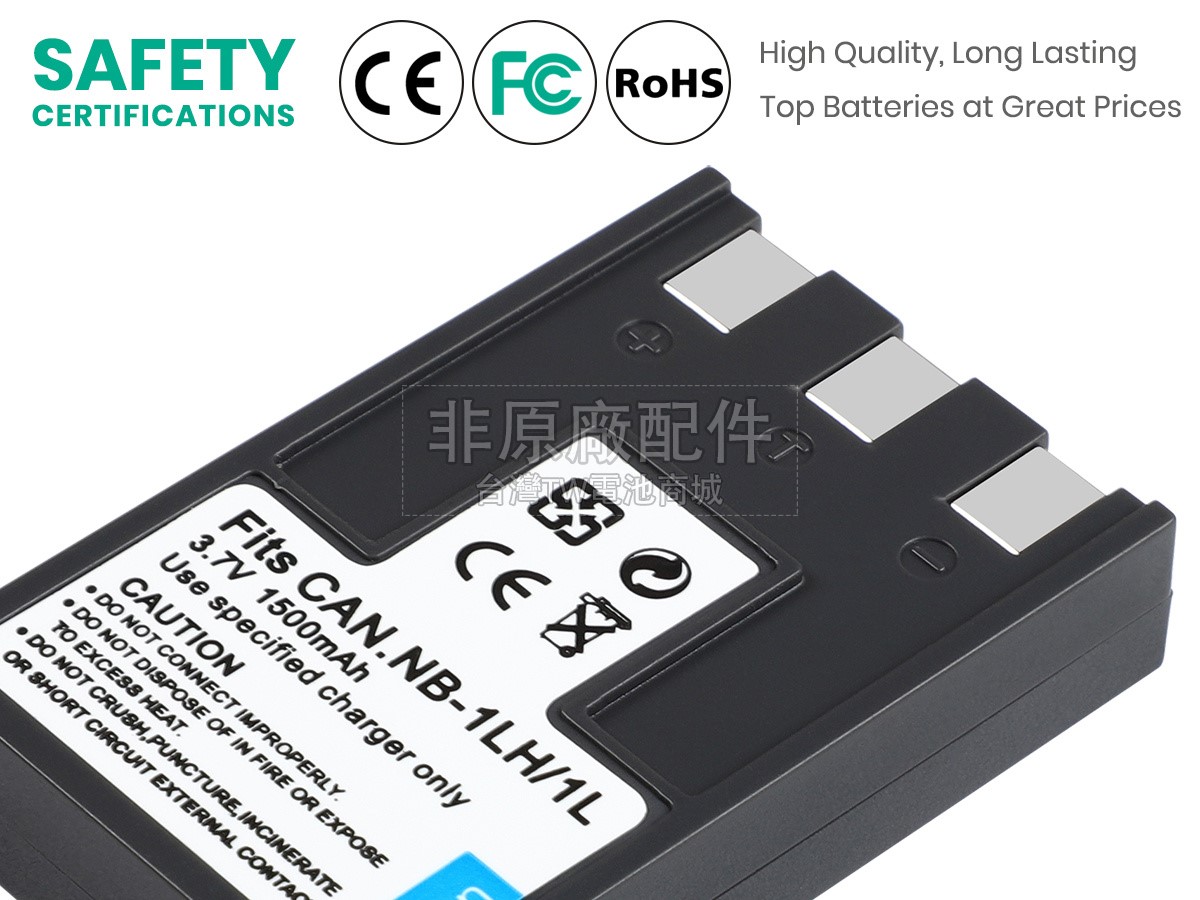 為什麼您應該從我們這裡購買CANON NB-1LH電池?電池是一種特殊的消耗品,用料的好壞直接決定了電池的性能和壽命。為了保證顧客良好的使用體驗,我們在這款原廠品質的Canon NB-1LH電池投入了高昂的材料成本,採用全新原廠進口的A+級電芯、美國德州TI芯片和耐高溫抗磨損的ABS+PC合金環保材料,經過100多道安全檢測製造而成。從而保證,這款電池無論在性能、壽命還是安全上都可以滿足您日常休閒、娛樂和辦公的需求。