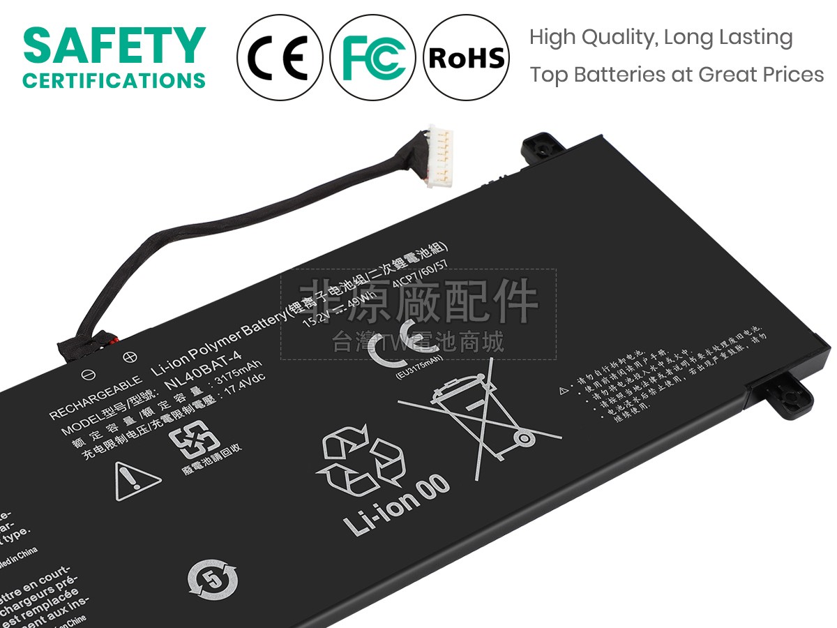 台灣TW電池商城售賣的所有電池均為100%真實容量,我們絕不會在參數上造假。對於製造商提供的每一款電池,我們都會安排技術人員進行參數測試,以確保我們售賣的電池都符合各種認證的要求、100%安全和100%兼容對應的筆記型電腦。極少數情況下,電池參數表上的容量會比電池實物圖上的容量低,這是因為我們檢測時發現製造商給出的電池容量偏高,與電池實際容量不符。於是我們會把電池的實際容量準確地填寫在參數表上,讓顧客直接看到電池的真實容量!這款Clevo NL40BAT-4電池和原廠有什麼區別?
