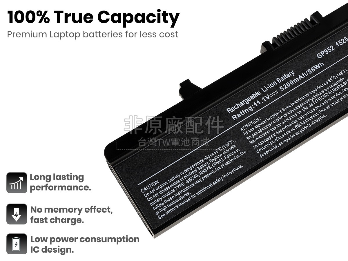 台灣TW電池商城售賣的所有電池均為100%真實容量,我們絕不會在參數上造假。對於製造商提供的每一款電池,我們都會安排技術人員進行參數測試,以確保我們售賣的電池都符合各種認證的要求、100%安全和100%兼容對應的筆記型電腦。極少數情況下,電池參數表上的容量會比電池實物圖上的容量低,這是因為我們檢測時發現製造商給出的電池容量偏高,與電池實際容量不符。於是我們會把電池的實際容量準確地填寫在參數表上,讓顧客直接看到電池的真實容量!這款Dell 0XR694電池和原廠有什麼區別?