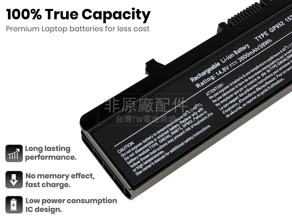 台灣TW電池商城售賣的所有電池均為100%真實容量,我們絕不會在參數上造假。對於製造商提供的每一款電池,我們都會安排技術人員進行參數測試,以確保我們售賣的電池都符合各種認證的要求、100%安全和100%兼容對應的筆記型電腦。極少數情況下,電池參數表上的容量會比電池實物圖上的容量低,這是因為我們檢測時發現製造商給出的電池容量偏高,與電池實際容量不符。於是我們會把電池的實際容量準確地填寫在參數表上,讓顧客直接看到電池的真實容量!這款Dell Inspiron 1440N電池和原廠有什麼區別?