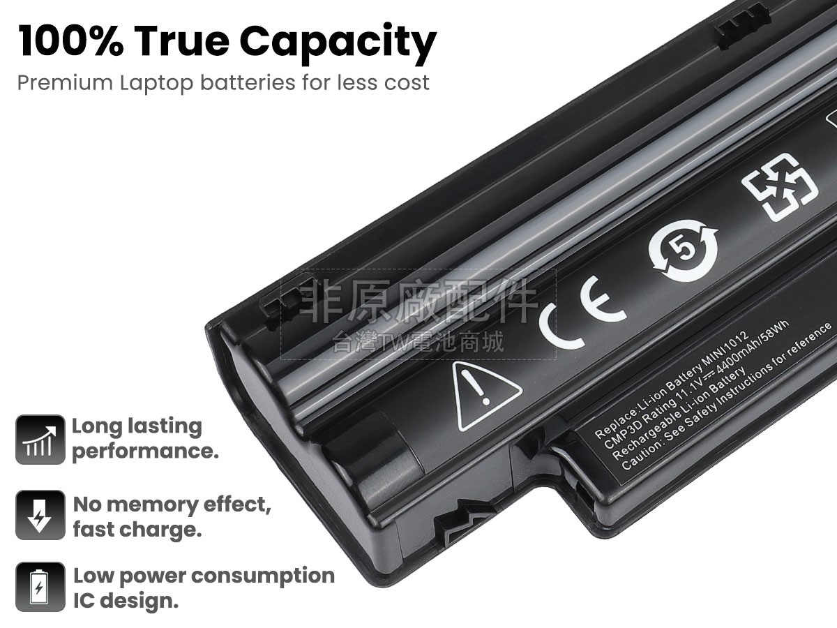 台灣TW電池商城售賣的所有電池均為100%真實容量,我們絕不會在參數上造假。對於製造商提供的每一款電池,我們都會安排技術人員進行參數測試,以確保我們售賣的電池都符合各種認證的要求、100%安全和100%兼容對應的筆記型電腦。極少數情況下,電池參數表上的容量會比電池實物圖上的容量低,這是因為我們檢測時發現製造商給出的電池容量偏高,與電池實際容量不符。於是我們會把電池的實際容量準確地填寫在參數表上,讓顧客直接看到電池的真實容量!這款Dell Inspiron Mini 1012電池和原廠有什麼區別?