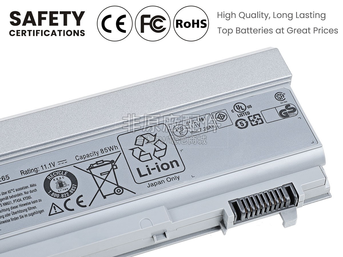 除了使用好的材料外,TW電池商城還以更高的行業標準檢測產品,目前我們的Dell KY265手提電腦電池已經通過日本PSE強制認證、歐盟RoHS環保認證、CE安全認證、美國FCC認證和MSDS化學品安全認證。