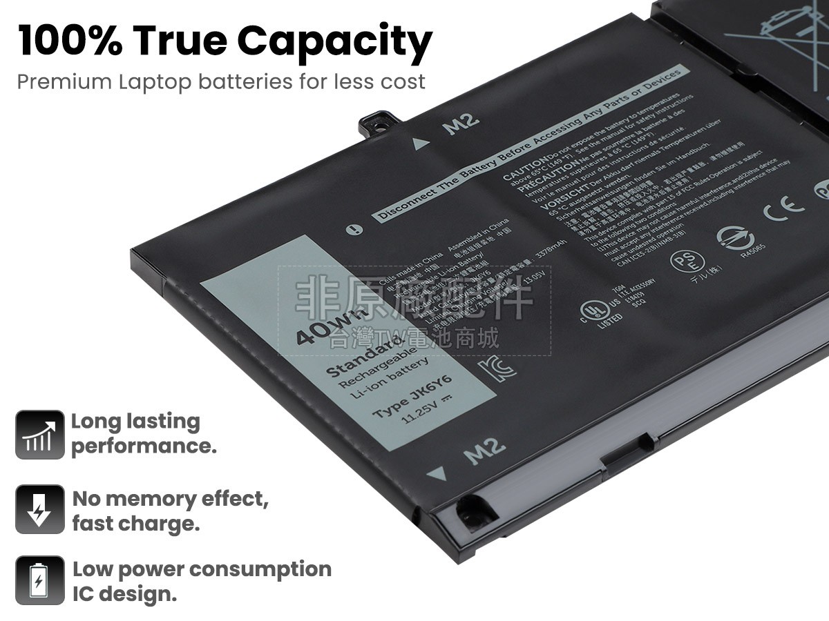 台灣TW電池商城售賣的所有電池均為100%真實容量,我們絕不會在參數上造假。對於製造商提供的每一款電池,我們都會安排技術人員進行參數測試,以確保我們售賣的電池都符合各種認證的要求、100%安全和100%兼容對應的筆記型電腦。極少數情況下,電池參數表上的容量會比電池實物圖上的容量低,這是因為我們檢測時發現製造商給出的電池容量偏高,與電池實際容量不符。於是我們會把電池的實際容量準確地填寫在參數表上,讓顧客直接看到電池的真實容量!這款Dell Vostro 5301電池和原廠有什麼區別?