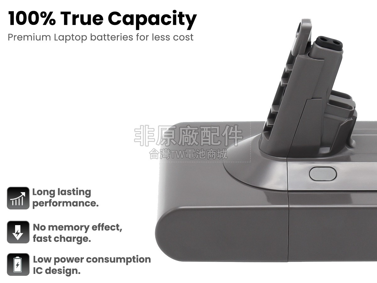 台灣TW電池商城售賣的所有電池均為100%真實容量,我們絕不會在參數上造假。對於製造商提供的每一款電池,我們都會安排技術人員進行參數測試,以確保我們售賣的電池都符合各種認證的要求、100%安全和100%兼容對應的無線吸層器。極少數情況下,電池參數表上的容量會比電池實物圖上的容量低,這是因為我們檢測時發現製造商給出的電池容量偏高,與電池實際容量不符。於是我們會把電池的實際容量準確地填寫在參數表上,讓顧客直接看到電池的真實容量!這款Dyson SV14電池和原廠有什麼區別?