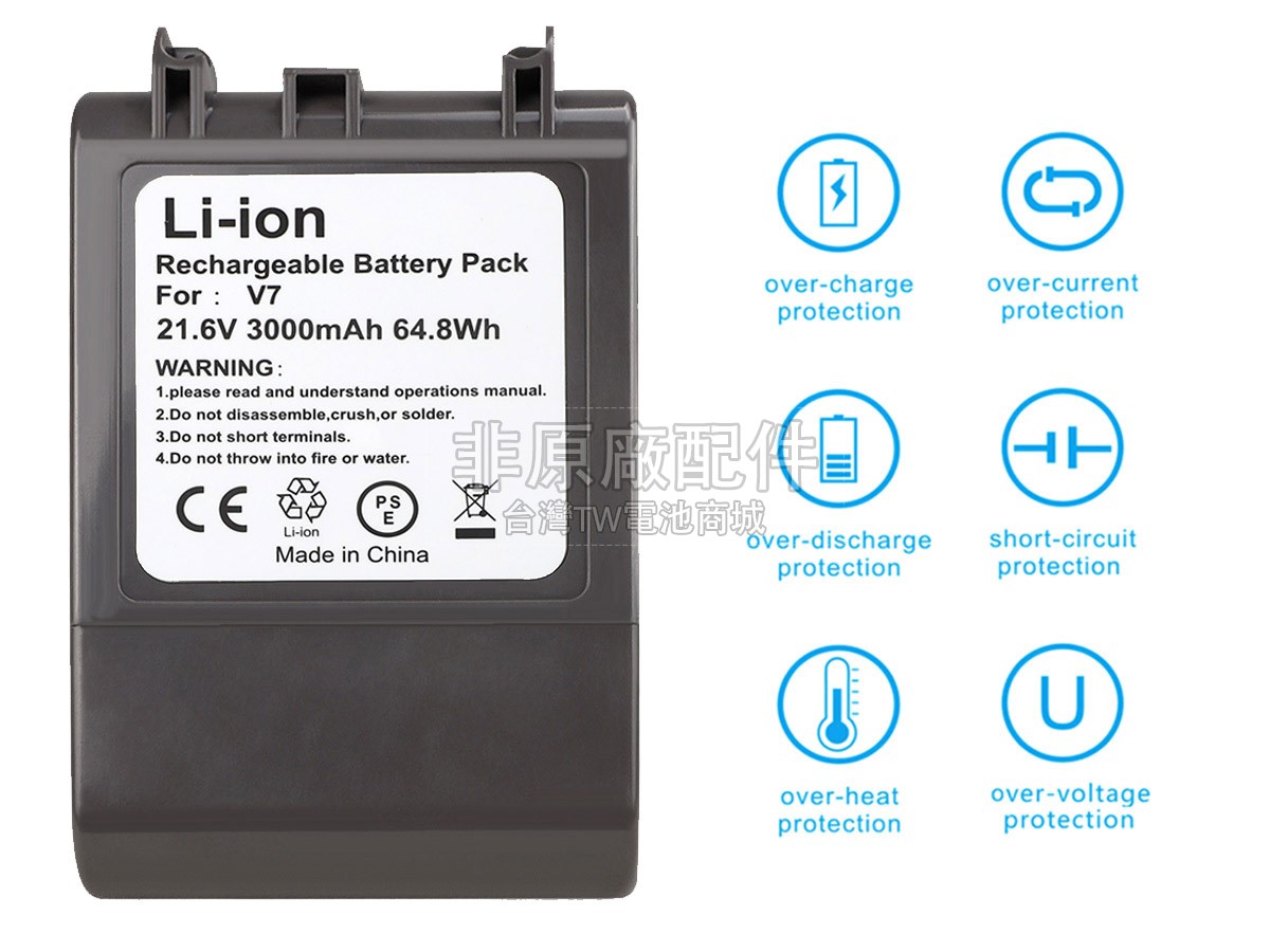 台灣TW電池商城售賣的所有電池均為100%真實容量,我們絕不會在參數上造假。對於製造商提供的每一款電池,我們都會安排技術人員進行參數測試,以確保我們售賣的電池都符合各種認證的要求、100%安全和100%兼容對應的無線吸層器。極少數情況下,電池參數表上的容量會比電池實物圖上的容量低,這是因為我們檢測時發現製造商給出的電池容量偏高,與電池實際容量不符。於是我們會把電池的實際容量準確地填寫在參數表上,讓顧客直接看到電池的真實容量!這款Dyson V7 MOTORHEAD PRO電池和原廠有什麼區別?