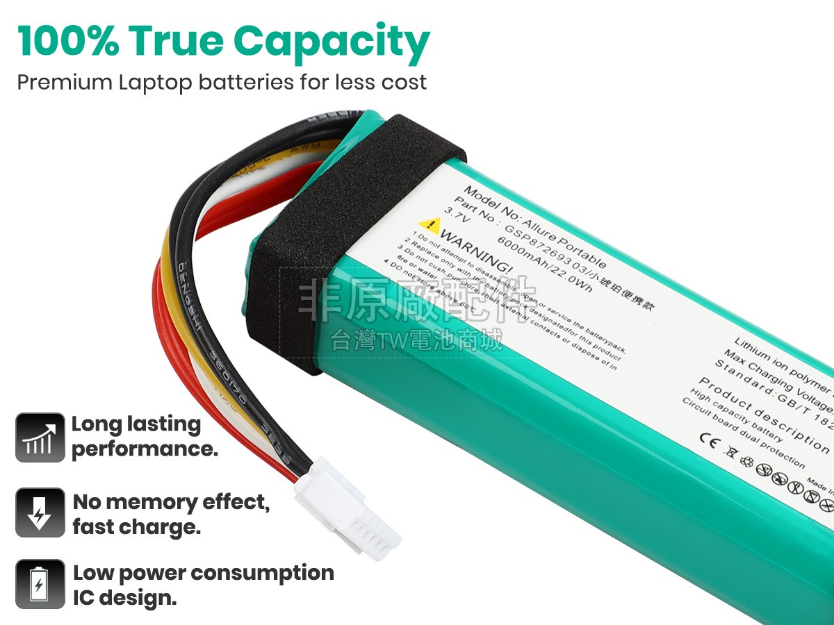 台灣TW電池商城售賣的所有電池均為100%真實容量,我們絕不會在參數上造假。對於製造商提供的每一款電池,我們都會安排技術人員進行參數測試,以確保我們售賣的電池都符合各種認證的要求、100%安全和100%兼容對應的音箱。極少數情況下,電池參數表上的容量會比電池實物圖上的容量低,這是因為我們檢測時發現製造商給出的電池容量偏高,與電池實際容量不符。於是我們會把電池的實際容量準確地填寫在參數表上,讓顧客直接看到電池的真實容量!這款Harman Kardon GSP872693 03電池和原廠有什麼區別?