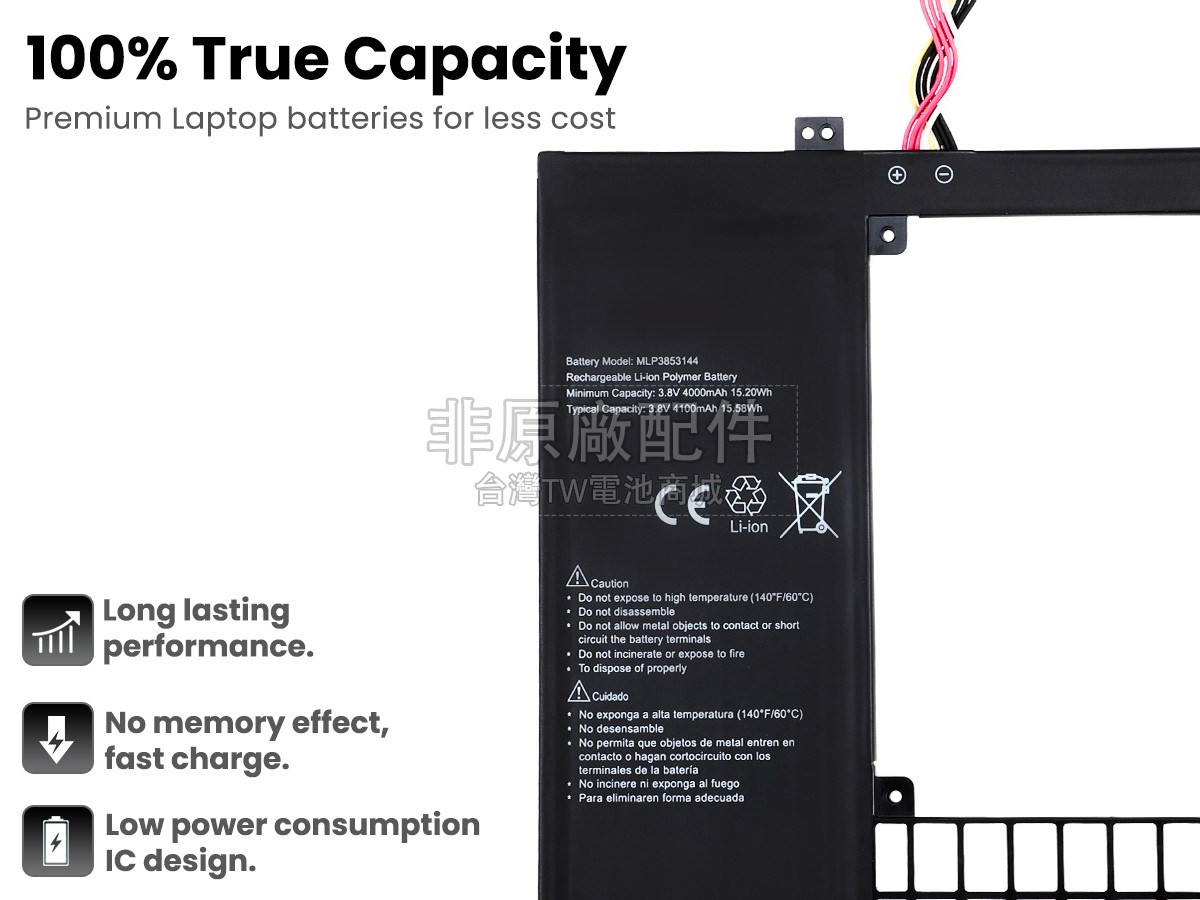 台灣TW電池商城售賣的所有電池均為100%真實容量,我們絕不會在參數上造假。對於製造商提供的每一款電池,我們都會安排技術人員進行參數測試,以確保我們售賣的電池都符合各種認證的要求、100%安全和100%兼容對應的筆記型電腦。極少數情況下,電池參數表上的容量會比電池實物圖上的容量低,這是因為我們檢測時發現製造商給出的電池容量偏高,與電池實際容量不符。於是我們會把電池的實際容量準確地填寫在參數表上,讓顧客直接看到電池的真實容量!這款HP MLP3853144電池和原廠有什麼區別?