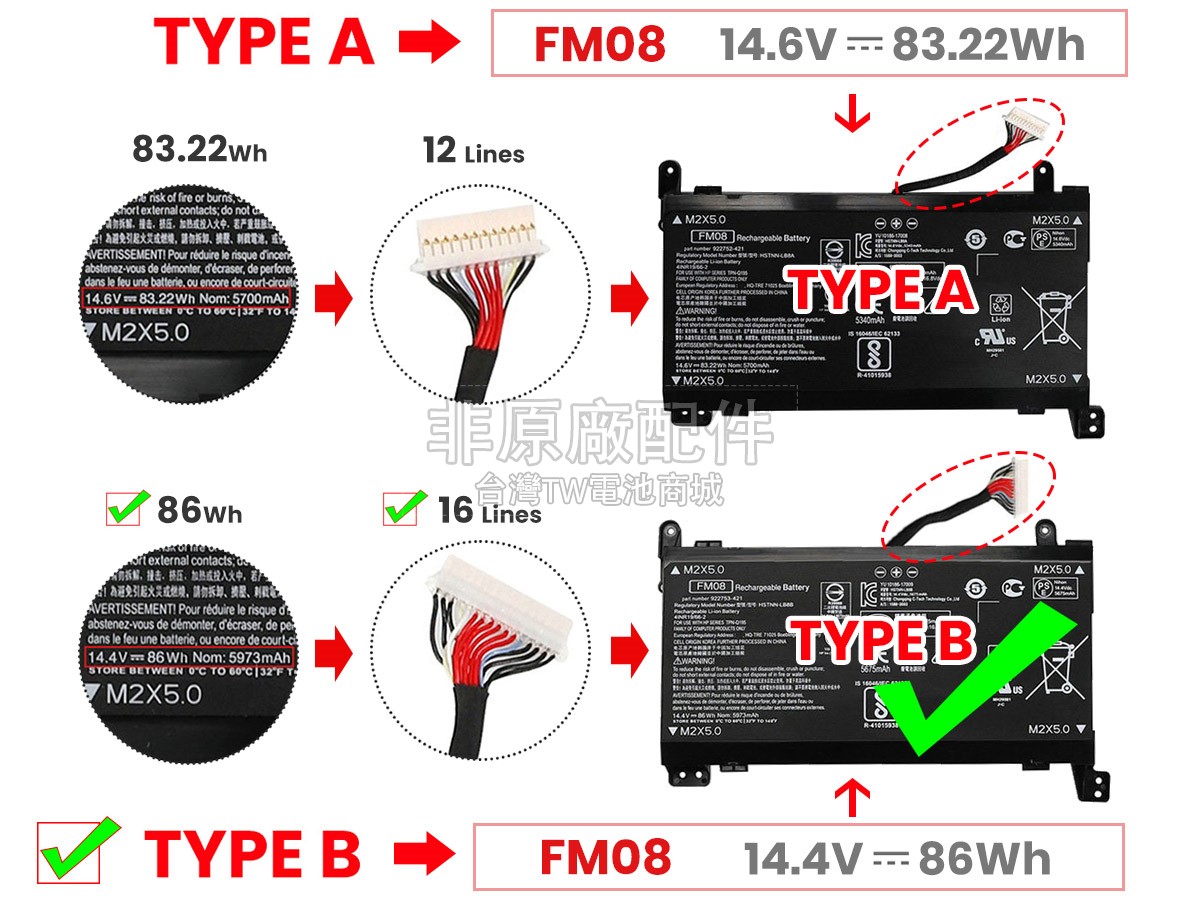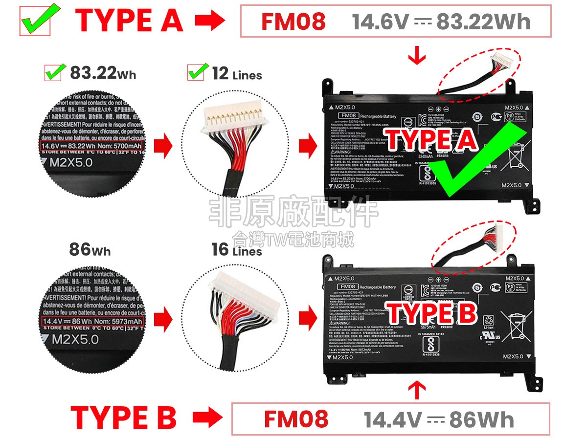台灣TW電池商城售賣的所有電池均為100%真實容量,我們絕不會在參數上造假。對於製造商提供的每一款電池,我們都會安排技術人員進行參數測試,以確保我們售賣的電池都符合各種認證的要求、100%安全和100%兼容對應的筆記型電腦。極少數情況下,電池參數表上的容量會比電池實物圖上的容量低,這是因為我們檢測時發現製造商給出的電池容量偏高,與電池實際容量不符。於是我們會把電池的實際容量準確地填寫在參數表上,讓顧客直接看到電池的真實容量!這款HP Omen 17-AN066TX電池和原廠有什麼區別?