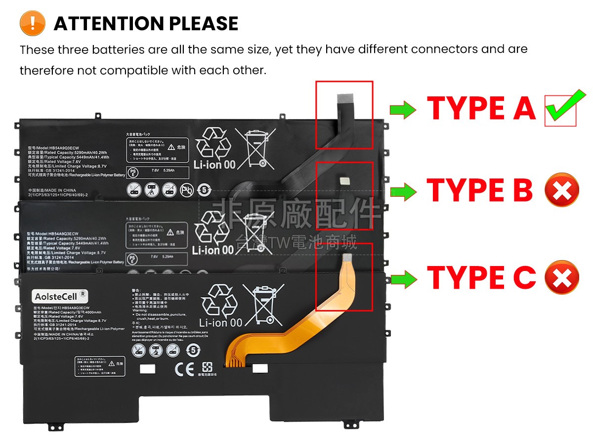 台灣TW電池商城售賣的所有電池均為100%真實容量,我們絕不會在參數上造假。對於製造商提供的每一款電池,我們都會安排技術人員進行參數測試,以確保我們售賣的電池都符合各種認證的要求、100%安全和100%兼容對應的筆記型電腦。極少數情況下,電池參數表上的容量會比電池實物圖上的容量低,這是因為我們檢測時發現製造商給出的電池容量偏高,與電池實際容量不符。於是我們會把電池的實際容量準確地填寫在參數表上,讓顧客直接看到電池的真實容量!這款Huawei HB54A9Q3ECW電池和原廠有什麼區別?
