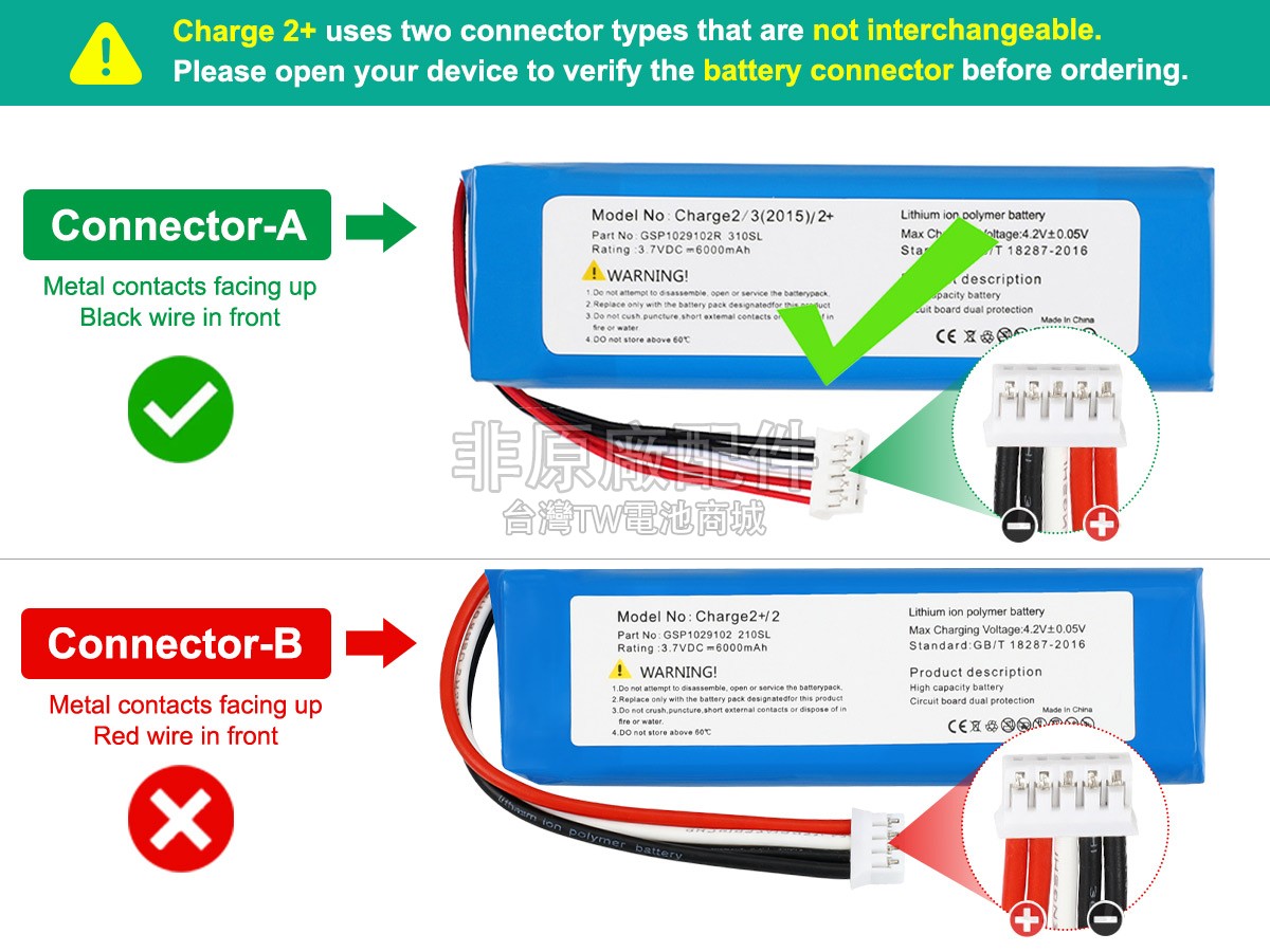 台灣TW電池商城售賣的所有電池均為100%真實容量,我們絕不會在參數上造假。對於製造商提供的每一款電池,我們都會安排技術人員進行參數測試,以確保我們售賣的電池都符合各種認證的要求、100%安全和100%兼容對應的音箱。極少數情況下,電池參數表上的容量會比電池實物圖上的容量低,這是因為我們檢測時發現製造商給出的電池容量偏高,與電池實際容量不符。於是我們會把電池的實際容量準確地填寫在參數表上,讓顧客直接看到電池的真實容量!這款JBL CHARGE 2+電池和原廠有什麼區別?
